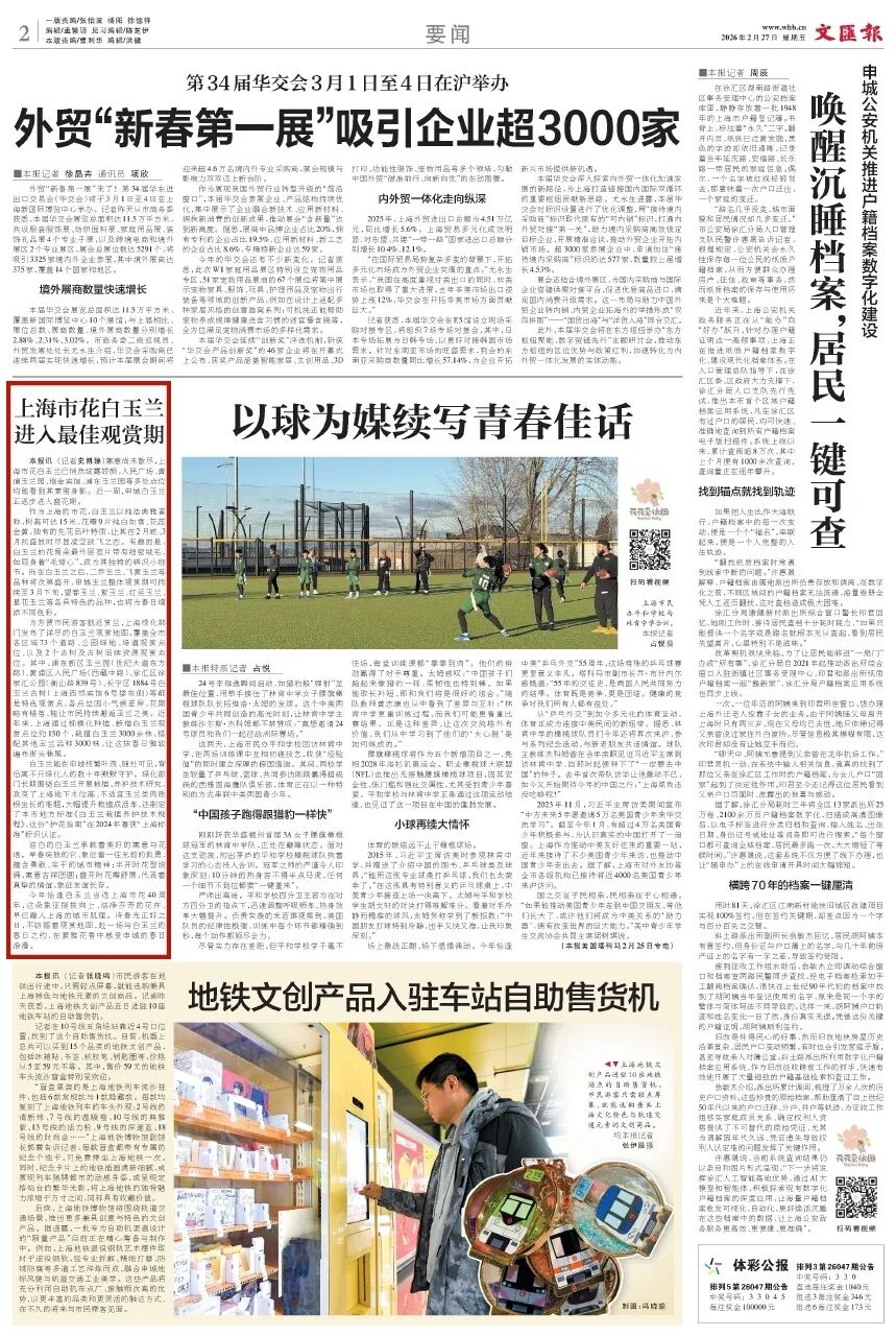 2月27日,《文汇报》要闻版报道:为方便市民游客就近赏兰,上海绿化部门发布了详尽的白玉兰观赏地图。其中,长宁区1884号白玉兰古树(上海西郊宾馆6号楼东侧)等都是特色观赏点。