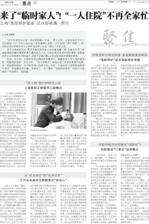 2月27日,《上海法治报》专版报道:早上九点,记者来到位于仙霞路1111号的上海交通大学附属同仁医院时,医疗护理员相中正和尹泽亚已开始工作。在“免陪照护”模式下,同仁医院推行“责任护士统筹+医疗护理员执行+护士长督查”的三级照护管理模式。截至目前,该院“免陪照护服务”实施“应开尽开”,已覆盖28个病区,其中包括4个监护病区和24个普通科室,近35000位患者接受过“免陪照护服务”,满意度达到99%,收费标准均为150元/天。