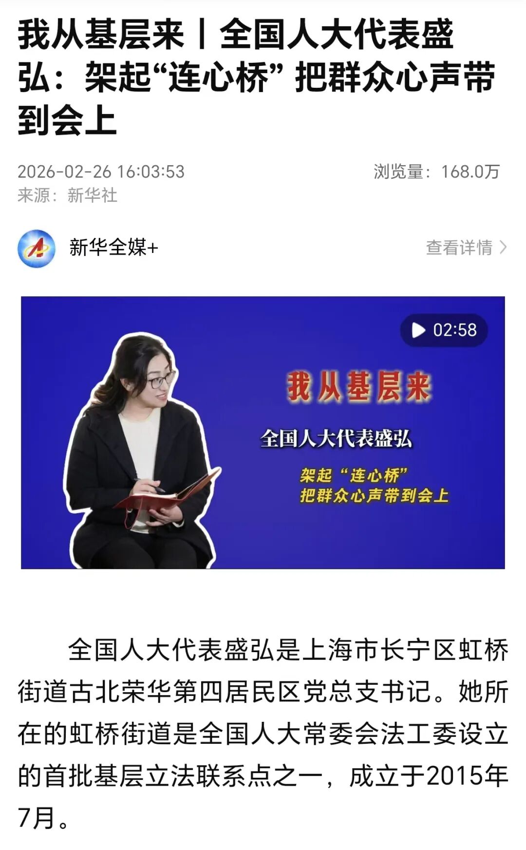 2月26日,《人民日报》、人民日报App、人民网、新华社App、新华网报道:前不久,一场关于民族团结进步促进法草案的立法意见征询会,在长宁区虹桥街道古北市民中心召开。这是一年来,全国人大代表、长宁区虹桥街道古北荣华第四居民区党总支书记盛弘参加的第十一场立法意见征询会。“一年来,立法征询会的议题涉及生态环境保护、城市治理、民生保障等方方面面。大家围绕法律草案各抒己见,提出具体修改建议。”盛弘说。“法律在满足‘幼有所育’的同时,积极回应广大群众对‘幼有优育’的深切期盼,针对性、及时性得到增强。”“作为一名基层人大代表,我将继续扎根群众,倾听民声,汇聚民智,把更多的声音带到人民大会堂,为推进全过程人民民主的基层实践、进一步提高立法质量贡献自己的力量。”盛弘说。近年来一些地方推动适老化改造。如今,在华阳路街道综合为老服务中心,老年人享受“小病不出院、大病直通车”的便利服务。