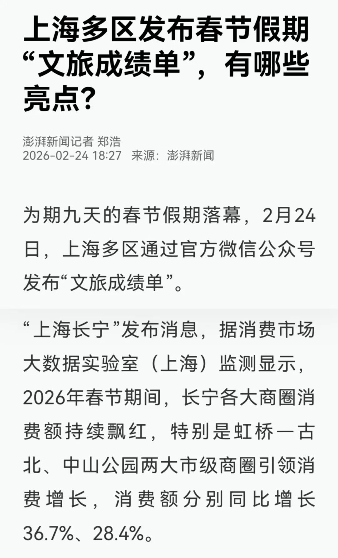 2月24日,澎湃新闻App、澎湃新闻报道:为期九天的春节假期落幕,2月24日,“上海长宁”发布消息,据消费市场大数据实验室(上海)监测显示,2026年春节期间,长宁各大商圈消费额持续飘红,特别是虹桥—古北、中山公园两大市级商圈引领消费增长,消费额分别同比增长36.7%、28.4%。