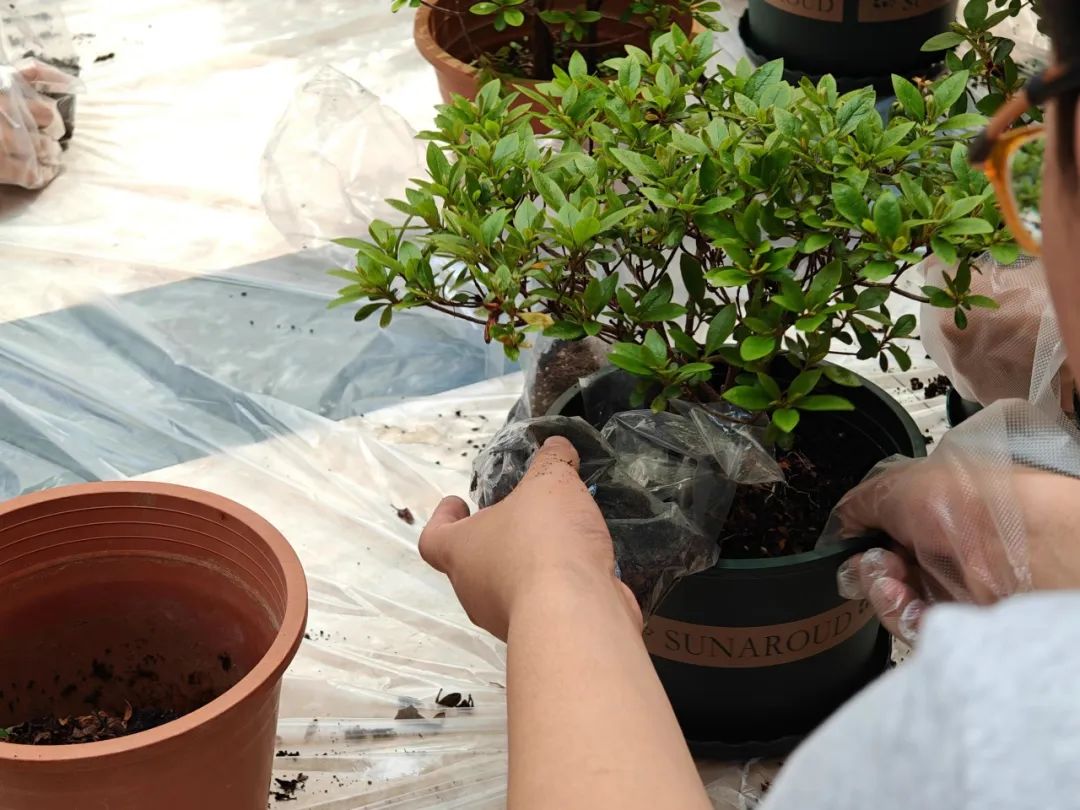 随后,学生们来到一楼大厅的园艺实践区,在园艺师的现场指导下,纷纷拿起小铲子、花盆等工具,铲土、施肥、培土、浇水,亲手种植属于自己的杜鹃花。