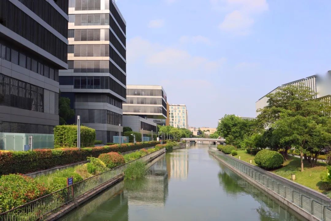 站在福泉北路朱家浜桥向着东西两侧眺望,可以看到茂密的绿植、碧绿的河水、湛蓝的天空和缤纷的鲜花组成的秀美景色,也可以将一幢幢充满时尚、现代气息的商务楼宇尽收眼底,二者相互映衬,交织出别具一格的园区风景。