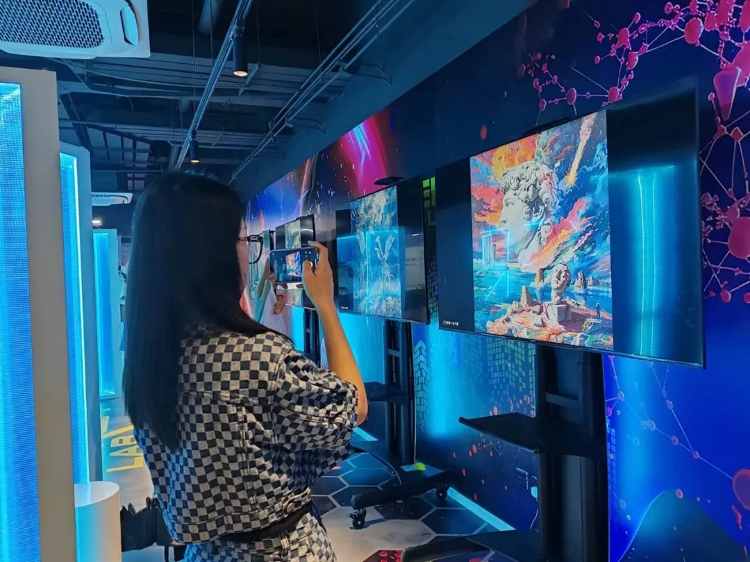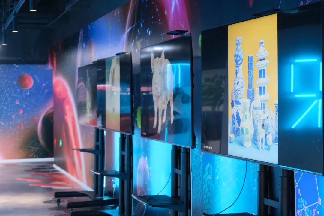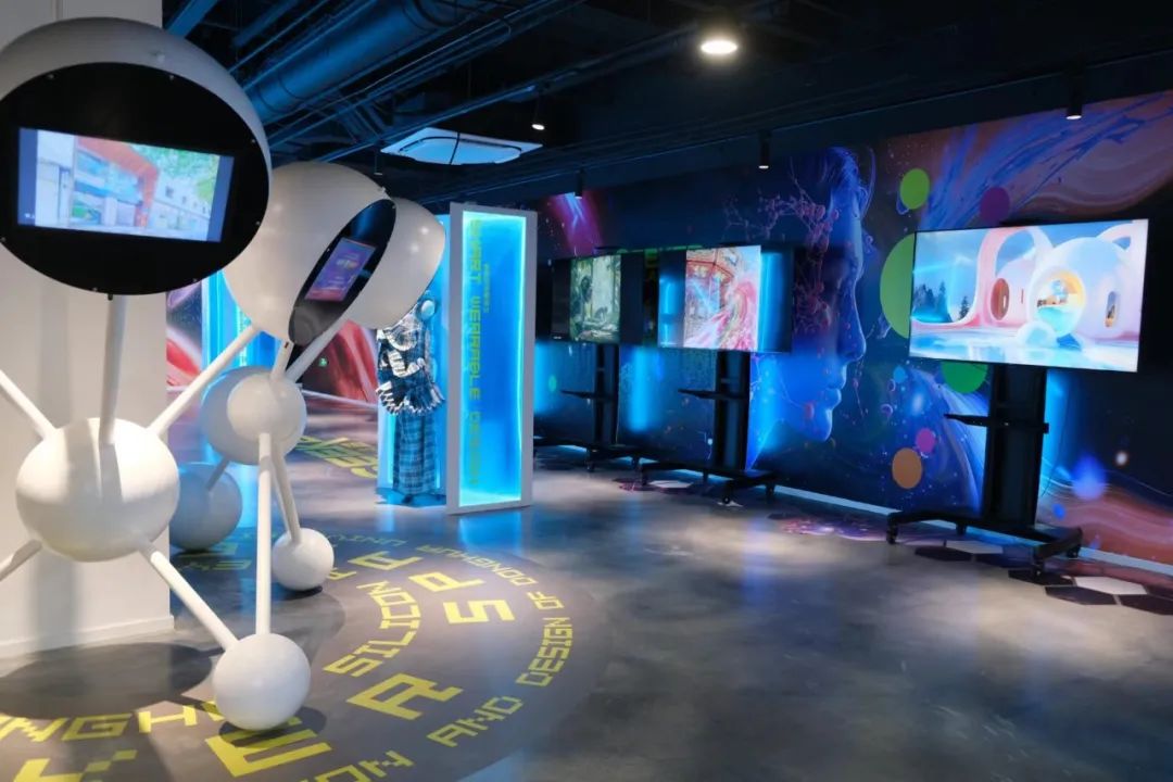 展览内容丰富多样,包括投影区(创客分享区)、电视屏区(AI新作系列展示)、“硅巷科创链”装置、三棱柱灯箱等多个区域,展出了部分东华大学师生与合作企业的作品,其中有生成式AI工作坊的教学成果、智能可穿戴设计和数字艺术的国际获奖作品。展览期间,还将举办东华大学视觉传达系校企合作课程的AIGC青年创客分享会。