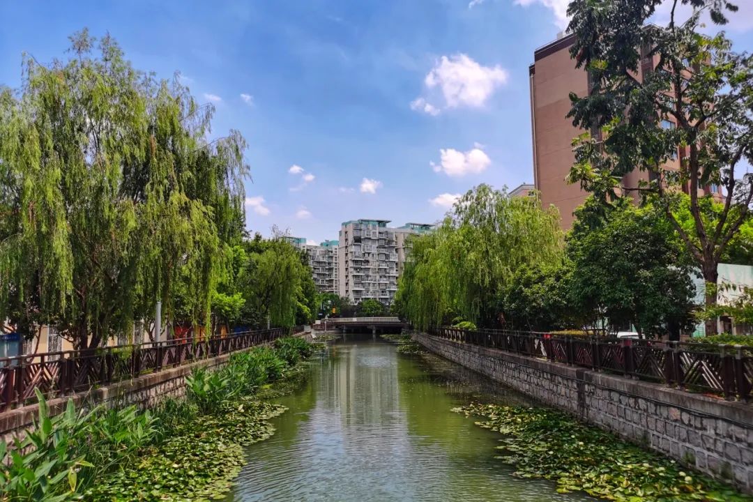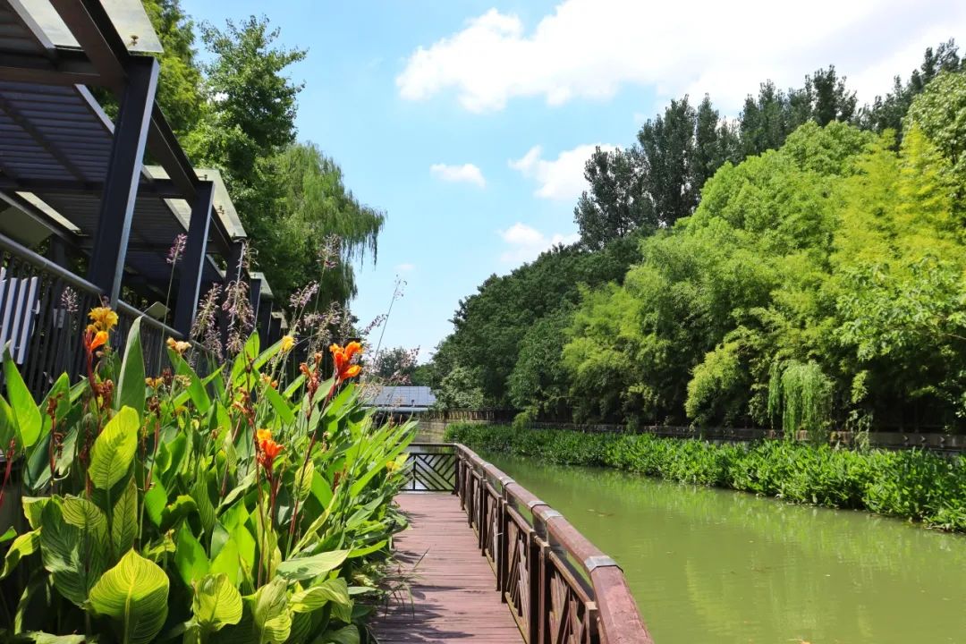 夏日的清晨,漫步在河岸的亲水平台,可以看到盛开的睡莲、梭鱼草等水生植物,感受五彩缤纷的河道风光。到了傍晚,站在亲水平台可以聆听河水潺潺的流淌声、树上的蝉鸣声,还有微风拂过树叶的沙沙声,感受自然生态的惬意。