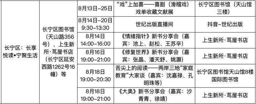 除了茑屋书店的“阅读无尽夏”书展活动周,上海书展长宁分会场还有“戏”上加喜——喜剧(滑稽戏)戏单收藏文献展、舌尖上的阅读——两岸三地“家庭教育”大家谈、世纪出版直播间在线直播等活动,让市民们尽享图书带来的快乐。
