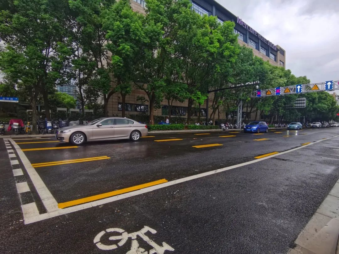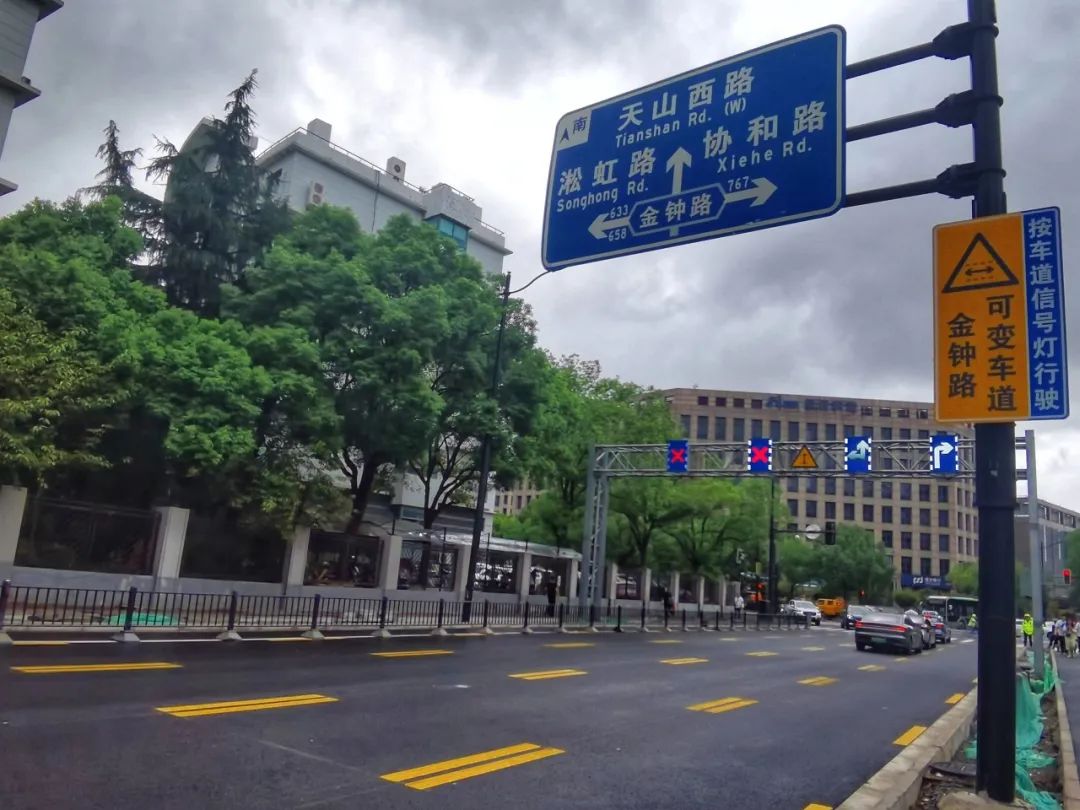 金钟路(协和路-福泉路)全长289米,原为双向四车道,考虑到高峰时段东向西交通流量较大,现将该路段改造为潮汐可变车道,变为潮汐可变双向四车道。