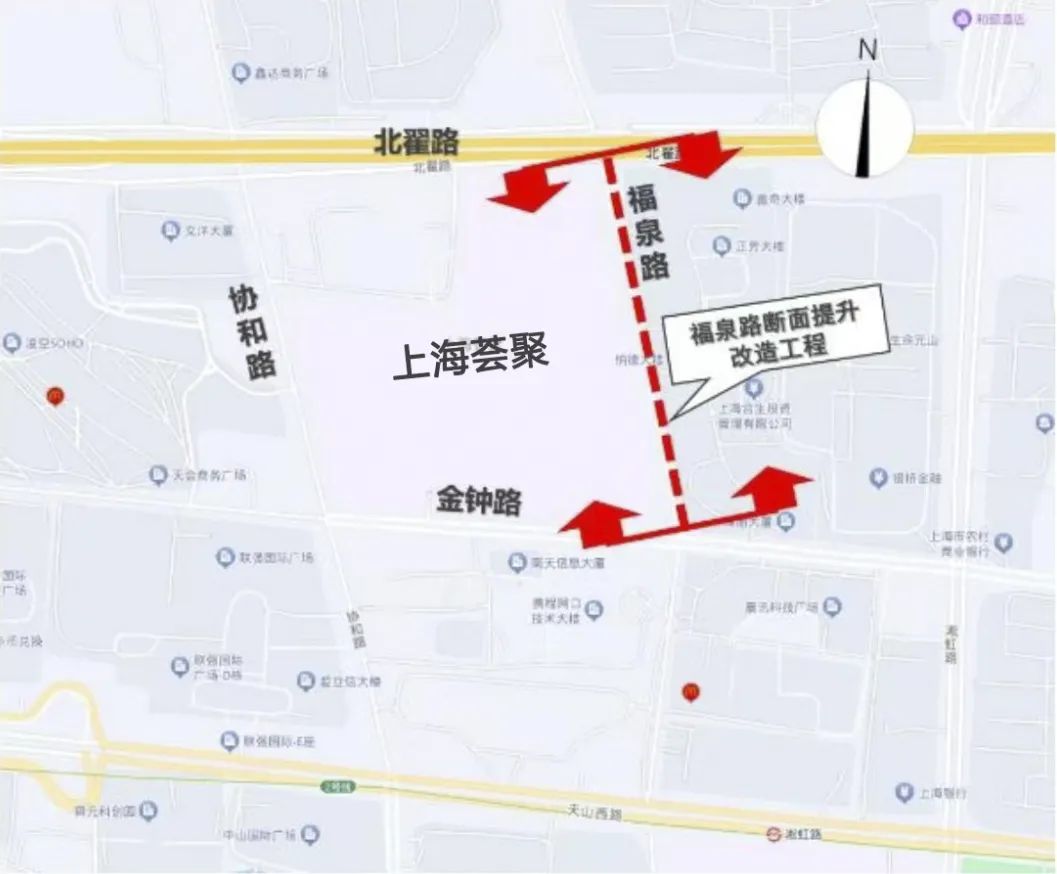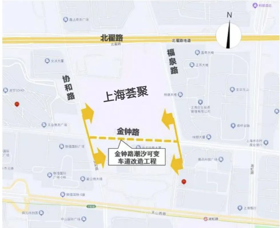 为确保上海荟聚开业后周边交通畅通有序,区建管委对金钟路(协和路-福泉路)、福泉路(北翟路-金钟路)进行断面提升改造及潮汐可变车道改造,目前已竣工通车。
