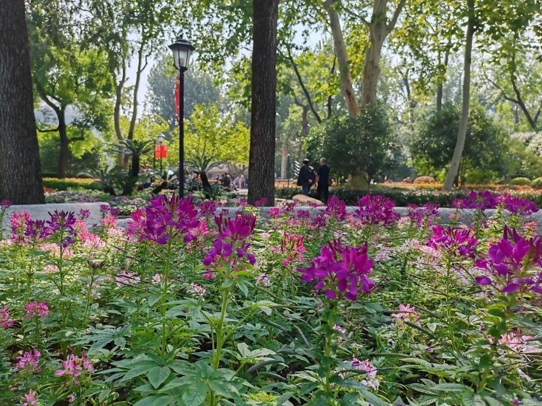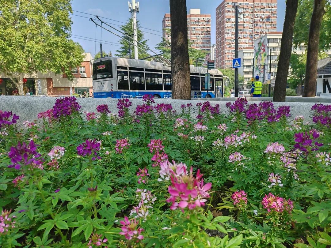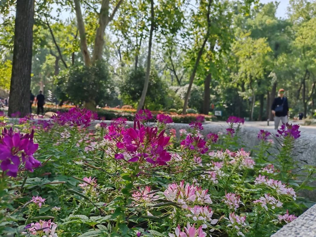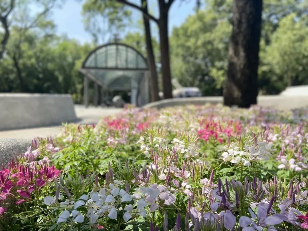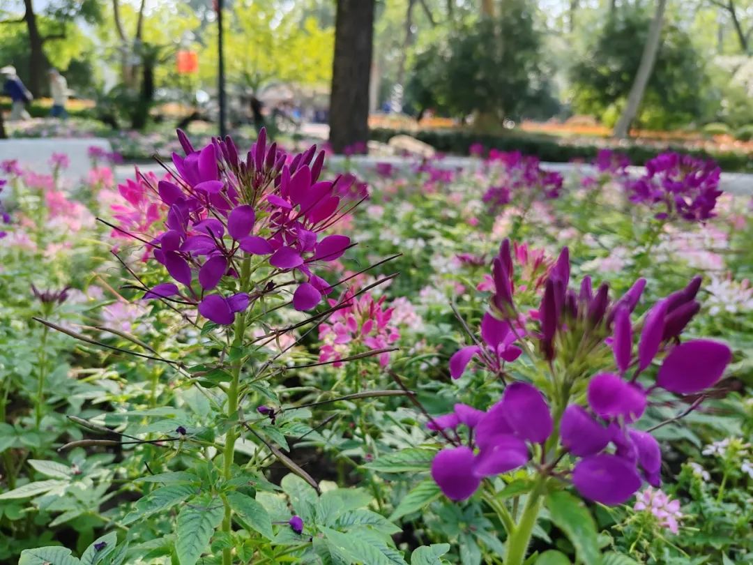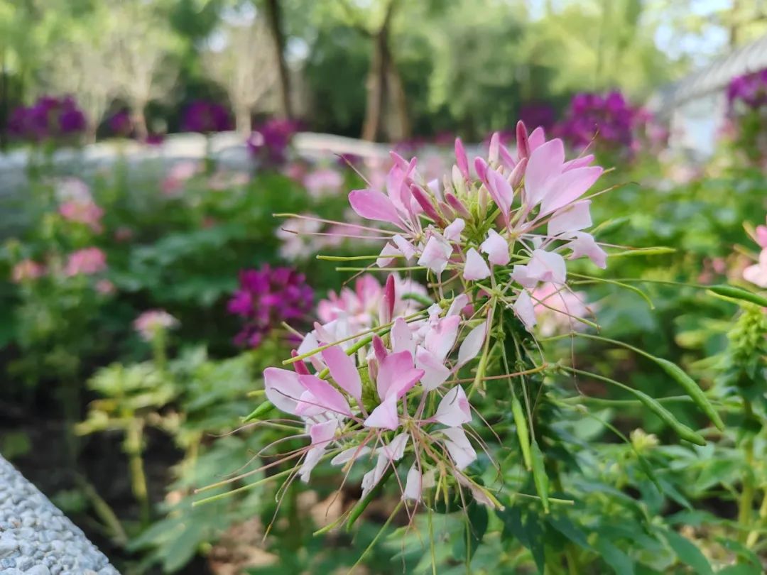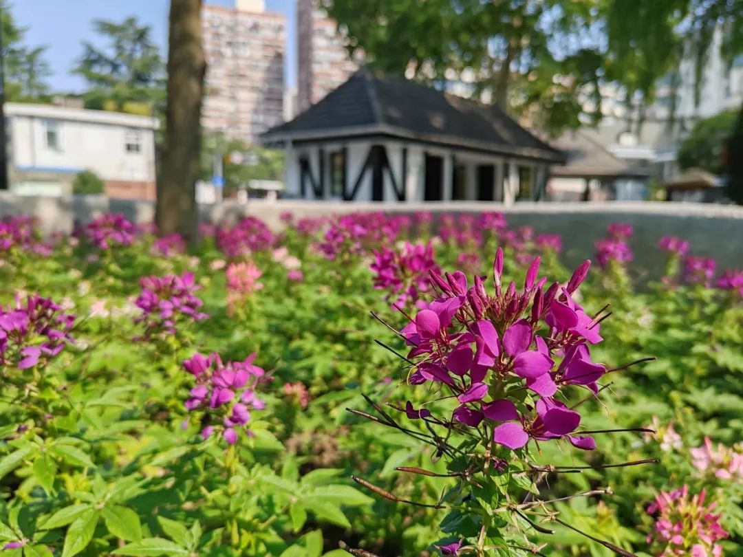 醉蝶花不仅花色娇艳,还兼具蜜腺,因此常常吸引大片蝴蝶在花丛中翩翩起舞。在天气晴好的日子里,中山公园的种子池内总是热闹非凡,醉蝶花与蝴蝶共同构成了一幅动人的画面,令人陶醉其中。