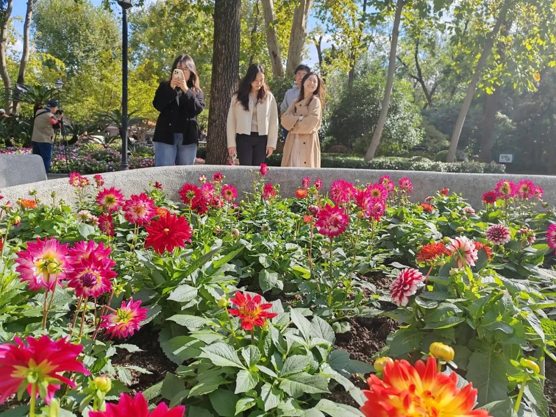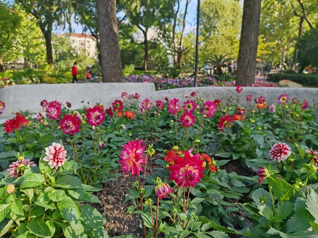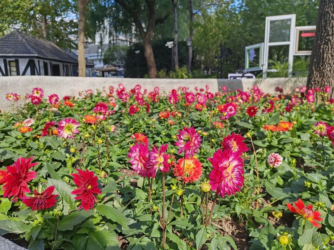 在中山公园,种子池里新种植的一批菊科大丽花竞相绽放,吸引了众多市民驻足观赏。大丽花色泽明亮、瑰丽多彩,粉色、红色、白色等单色及各种复色交织在一起,构成了一幅幅美丽的画卷。