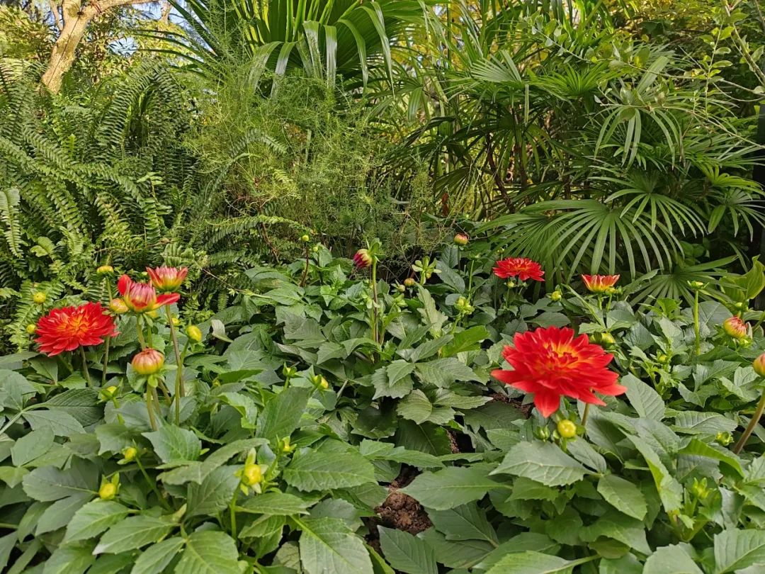 大丽花,名如其花,外形的确大,有的品种和牡丹花一样大。中山公园里的大丽花如茶盏一般大,远远望去就很吸睛。再走近仔细瞧,大丽花的花瓣小且呈扁圆状,重重叠叠,吐出一层是艳丽,再来一层还是艳丽,如年华正好的女子,随意一个眼波流转,都堪称绝色。