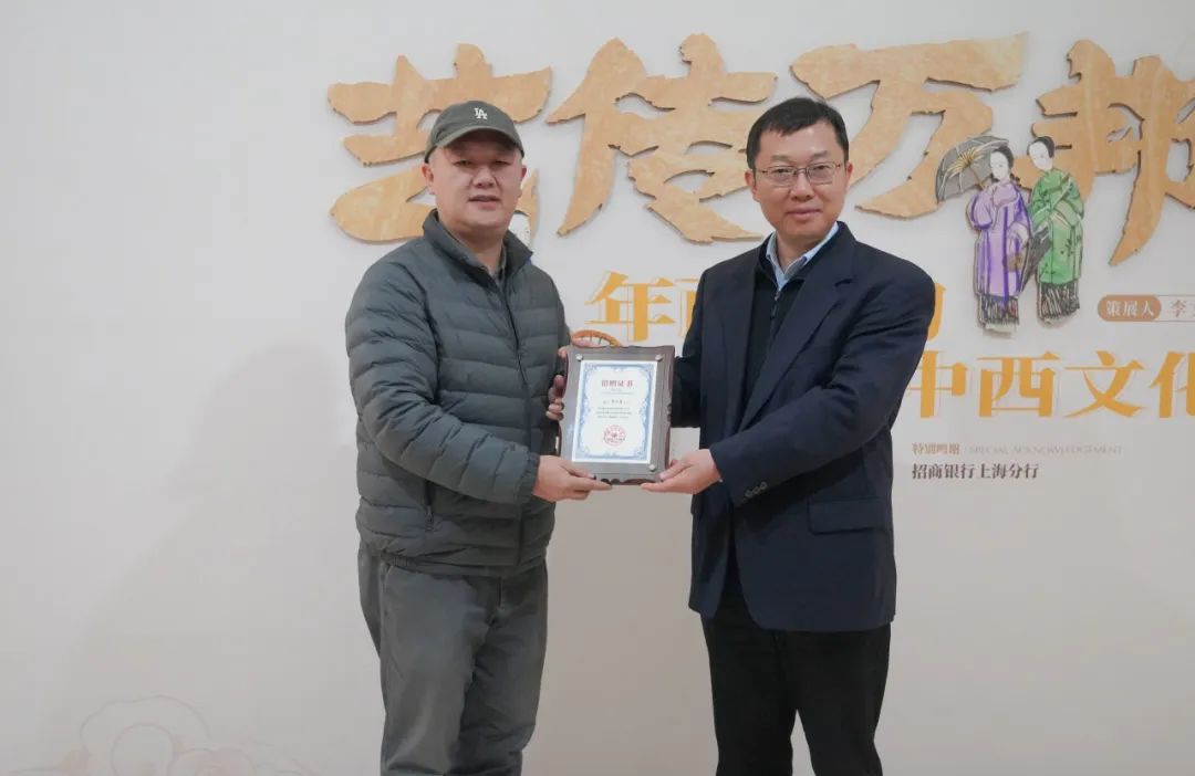开幕式上,上海对外经贸大学校长汪荣明(右)为上海城建职业学院教授、知名年画收藏家、本次展览策展人李文墨颁发捐赠证书。