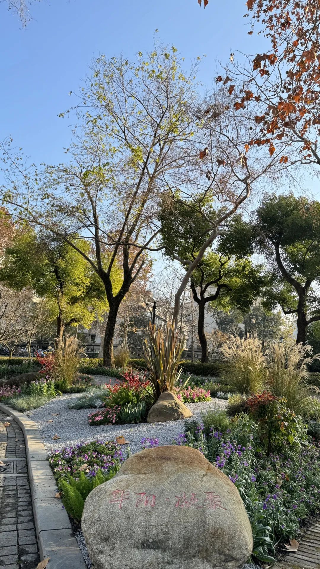 而紧挨着种子池的花坛,也有了新亮点——年宵花北美冬青闪亮登场。一簇簇火红的果实点亮了整个花坛,它们红得鲜艳、红得热烈,把新年的热闹氛围瞬间拉满。