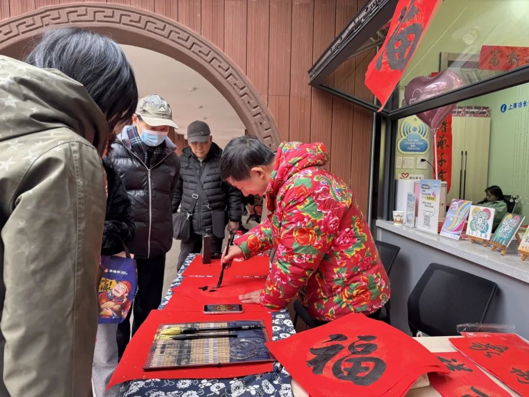 下午2点,长宁区旅游咨询服务中心门前格外热闹,金色与蛇形元素的装饰随处可见,营造出浓厚的节日氛围。上海市书法家协会会员王传刚正挥毫泼墨,为市民书写福字。其书法笔力遒劲,一笔一划间都透着深厚的艺术功底。在王传刚笔下,一个个“福”字跃然纸上,金色的笔墨在红纸上闪耀着光芒,引得市民们纷纷驻足观看。