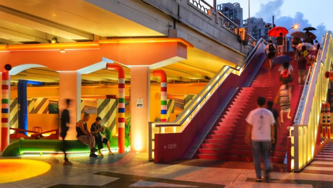 作为“城市项链”的开篇节点,苏河超级管以梦幻多巴胺色系灯光激活桥下空间,艺术装置与滨水护栏灯光呼应,让原本闲置的桥下空间变身成“夜间乐园”。