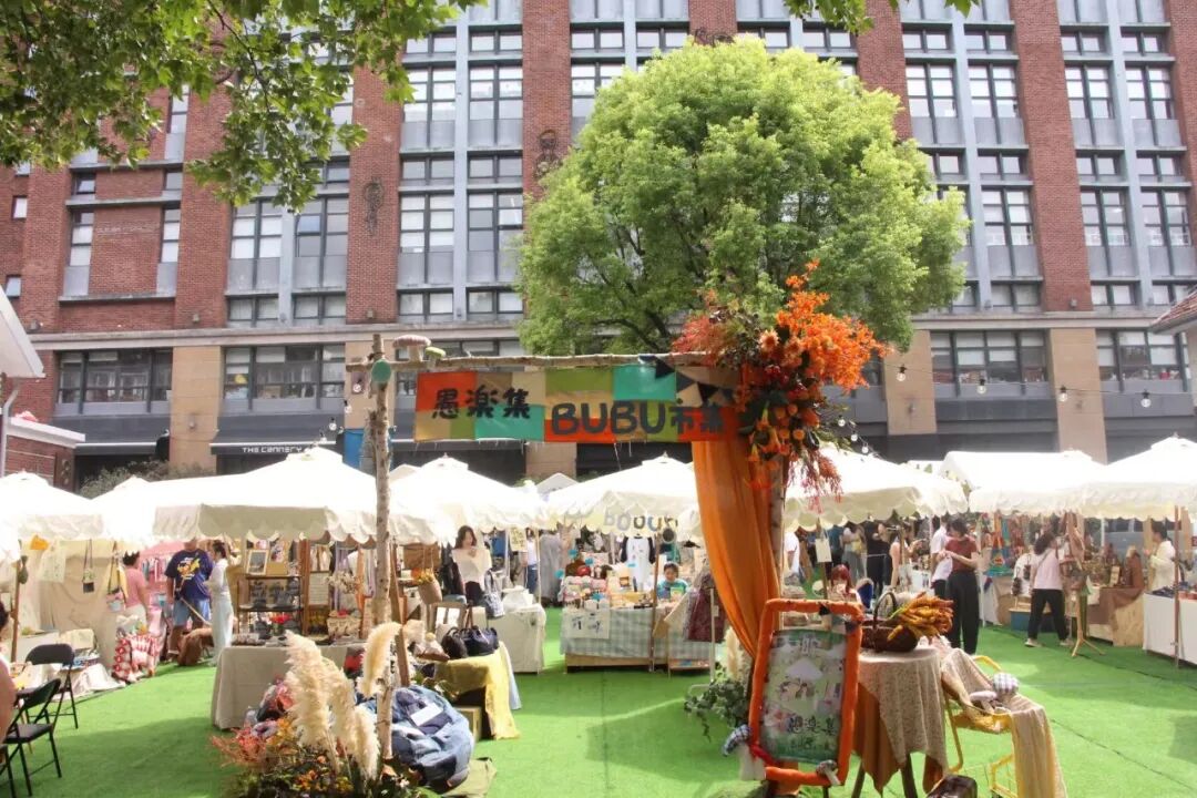 继续前行,来到愚园路1088弄的创邑SPACE,草坪上举办的“愚楽集·BuBu 市集”可谓是秋日惊喜:3大打卡点位、1大体验区,再加上24个独立品牌铺位,涵盖手工美学、绘画手账、钩线织物、扎染蓝染等特色好物,既能购物打卡,又能感受大树下的草坪慢生活,惬意十足。