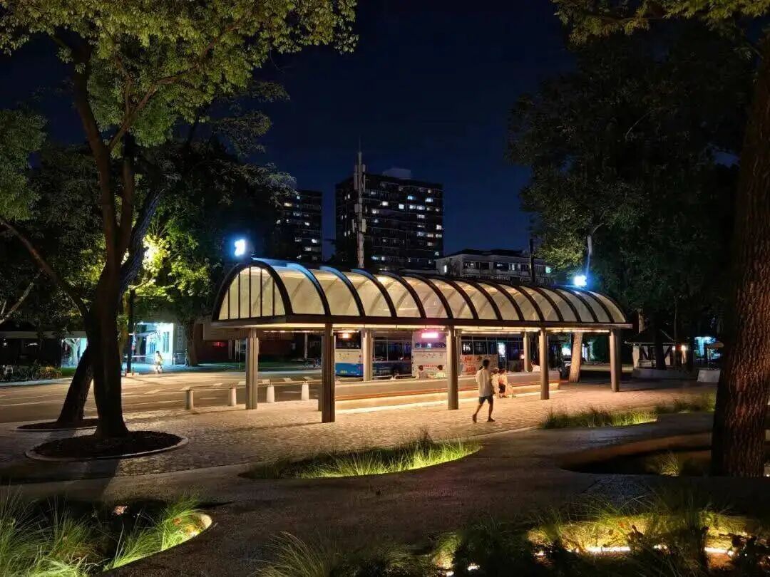商圈周边的自然与文化景观,更让夜景的内涵愈发丰富。苏州河华政段的水面化作天然的“光影画布”,岸边灯光倒映水中,随波荡漾形成流动的“光影长河”,与河畔步道上散步、赏景的市民相映成趣,勾勒出灵动的水岸夜韵。华东政法大学中山公园万航渡路开放共享段内,百年校园建筑与光影装置碰撞,灯光勾勒出建筑的精致轮廓,书卷气与艺术感在此融合,吸引不少市民漫步其间,感受文化与光影交织的独特魅力。