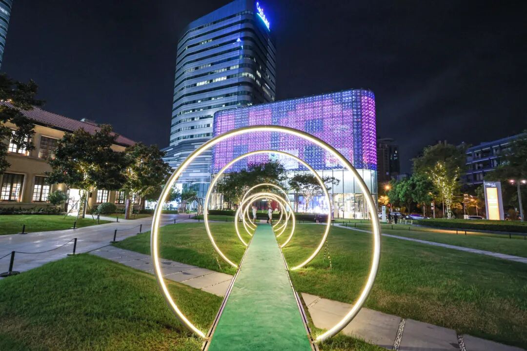 若说龙之梦是“活力代表”,长宁来福士广场则演绎着“古今对话”的独特浪漫。钟楼、思卜堂等优秀历史建筑,在灯光的映衬下,既保留了砖石肌理承载的历史厚重感,又被注入现代光影艺术的灵动感,老建筑的飞檐斗拱与灯光交织,仿佛在诉说着跨越时空的故事。