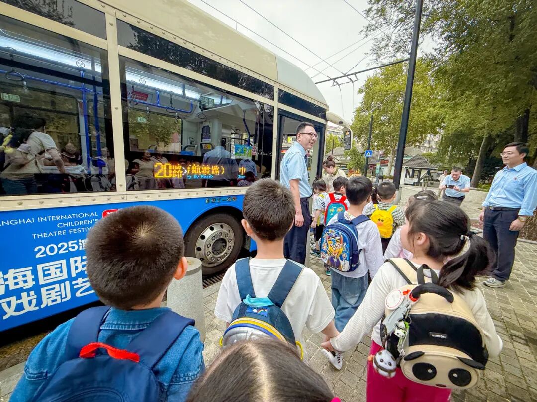 接着,走出校园的实地探访则将这场学习之旅推向高潮。在中山公园2号门对面的20路终点站,两辆擦拭得锃亮的公交车早早等候。孩子们分成两批,在司机的带领下开启了“车厢探索之旅”:他们的小手轻轻抚摸无障碍设施,趴在窗边观察“小辫子”如何与电线亲密接触,还好奇地查看座椅上方的逃生锤,学习“遇到危险时的保护小知识”。