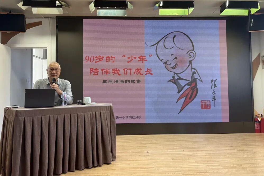 在愚一小学向红分校,活动邀请张乐平先生之子张慰军为师生们带来《90岁的“少年”陪伴我们成长——三毛漫画的故事》讲座。“调侃、幽默、逗趣,还有搞笑夸张,在这一套漫画里都淋漓尽致地表现出来了。”对于人们耳熟能详的《三毛从军记》《三毛流浪记》等三毛系列作品,张慰军在讲座中展示了大量四格漫画,并结合时代背景,向大家讲述了其父亲创作的心路历程。有趣的漫画、生动的故事,孩子们听得聚精会神。学校老师表示,今天听了张老师的讲述,我们认识到在那个时代中的张乐平先生始终非常乐观,有着不屈不挠的精神,“我们现在的生活非常幸福,一定要学会珍惜,也要学会传承张乐平先生的积极精神”。