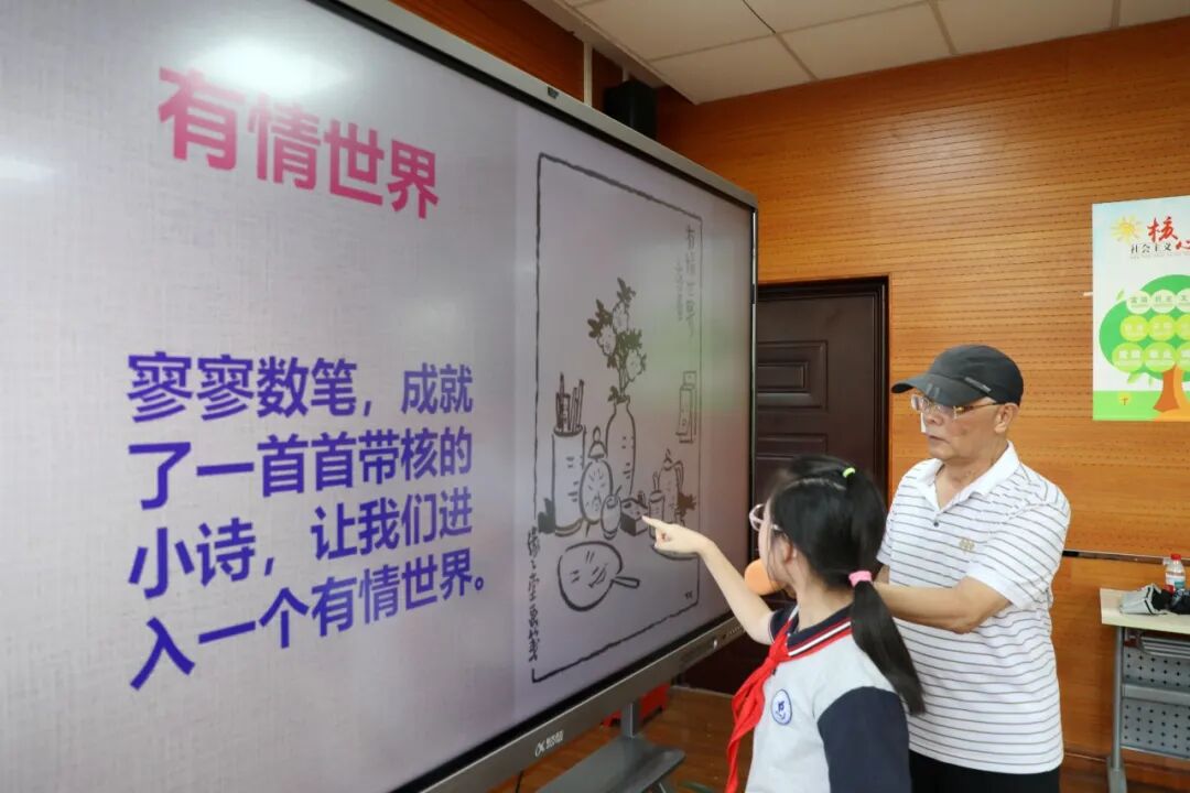 在玉屏南路小学,丰子恺外孙、上海丰子恺研究会原理事长宋雪君,为学校师生们带来了一堂有趣的“漫画课”——《读懂外公丰子恺的漫画》。宋雪君展示了许多丰子恺的漫画作品,有的有着深刻的时代印迹,有的充满浓浓的生活气息,还有的既荒诞有趣又能激发孩子思考,极富教育意义。宋雪君还不时与孩子们互动,模仿漫画中的场景,感受着穿越时空的童趣和不变的教育初心。“我们随着宋老师慢慢‘打开’了丰子恺先生的漫画,这些漫画非常幽默风趣。”学校德育教导徐老师表示,丰子恺先生用他的笔触,记录了生活中很多细节,也希望我们小朋友能像丰子恺先生一样,去感受并发现平凡生活中的温暖日常。