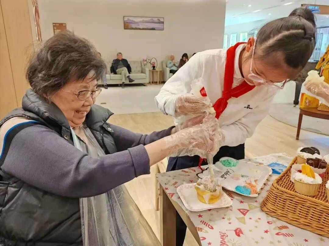 最温馨的莫过于老少齐做蛋糕环节了。孩子们小心翼翼地帮老人戴上围裙和手套,大家纷纷化身“甜点大师”,你涂抹奶油,我摆放水果,兴致勃勃地动手操作起来,不断完善自己的作品,现场欢声笑语不断。