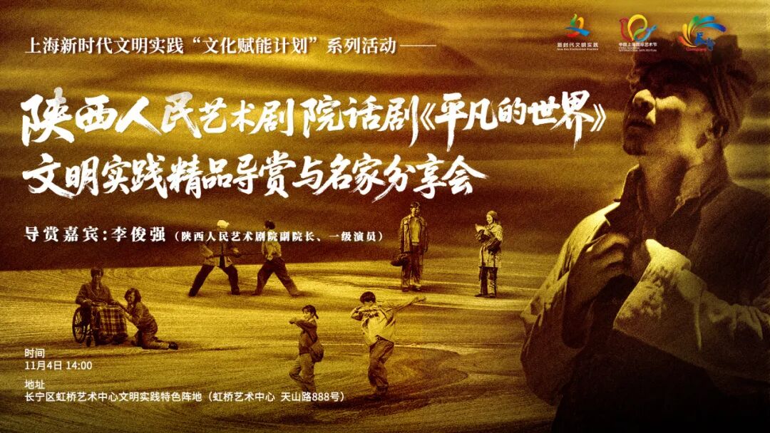 “孙少安”要从《平凡的世界》来长宁了!11月4日,长宁区文明办将在虹桥艺术中心举办上海新时代文明实践“文化赋能计划”系列活动——陕西人民艺术剧院话剧《平凡的世界》主演李俊强分享会,同时,分享会也是第24届中国上海国际艺术节“艺术教育”系列活动之一。