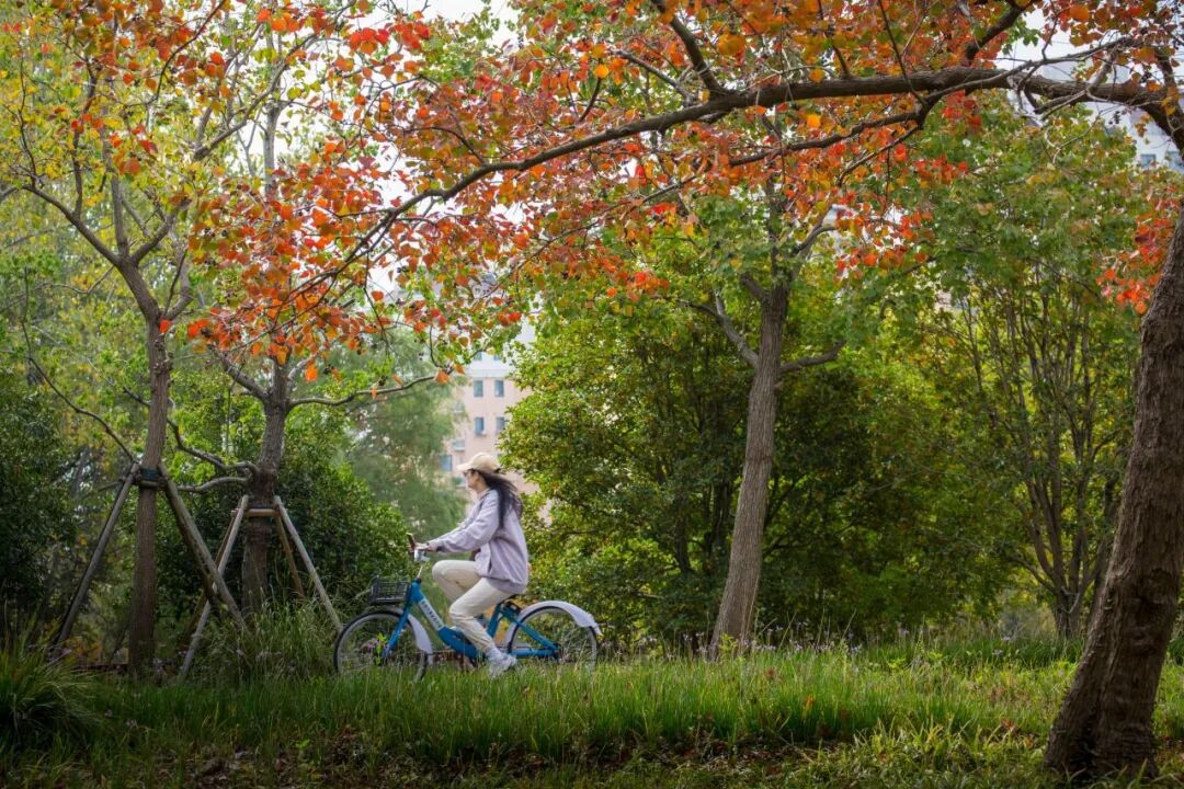 沿绿道徐行,秋色层次渐显:乌桕树已褪去翠绿,叶片染上深浅不一的嫣红,在阳光下灼灼生辉,成为秋日里的一抹亮色。