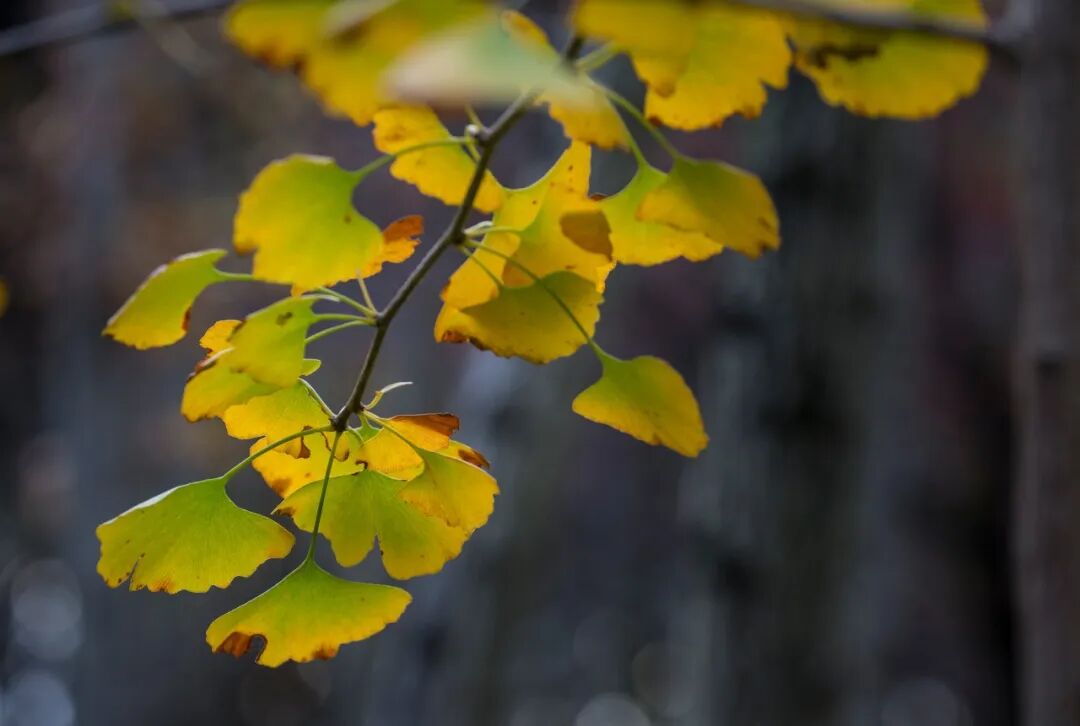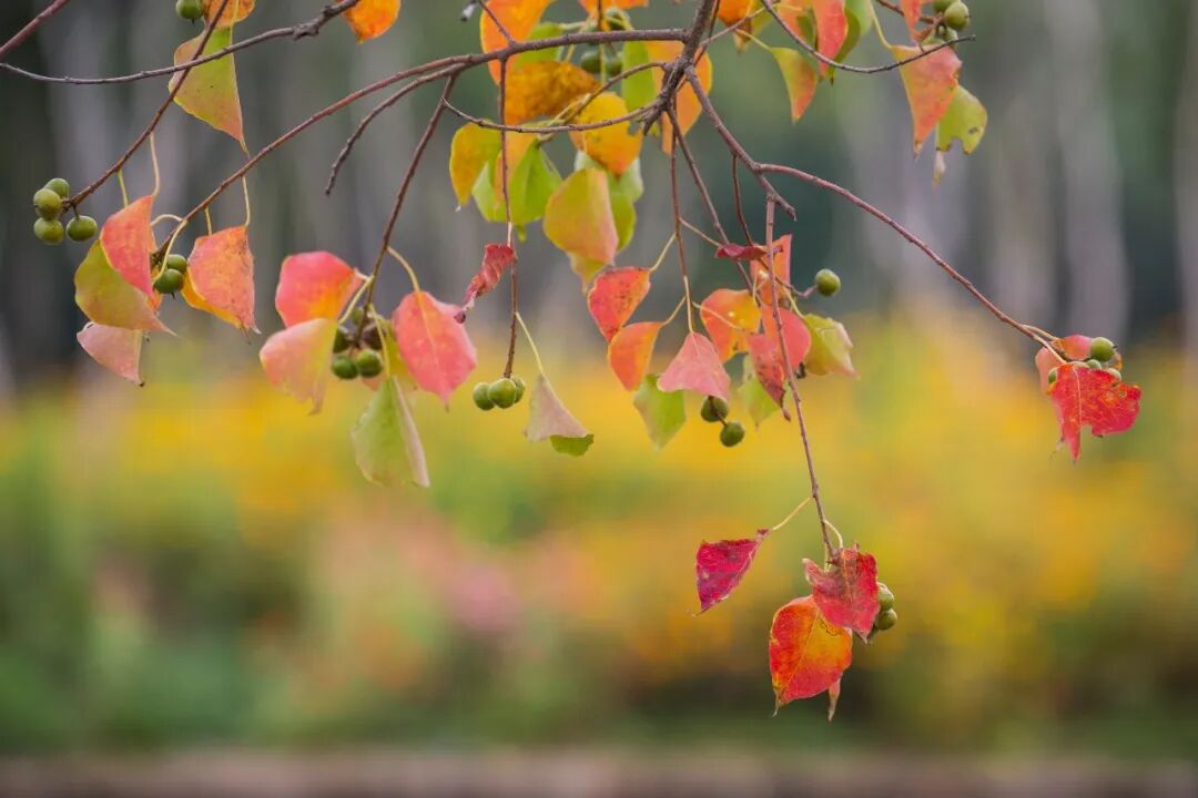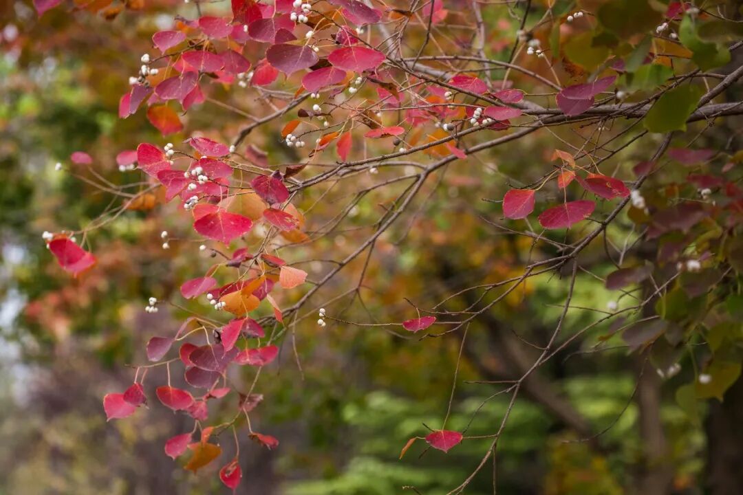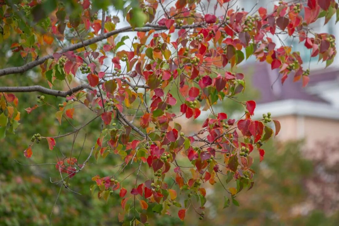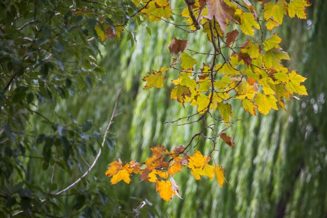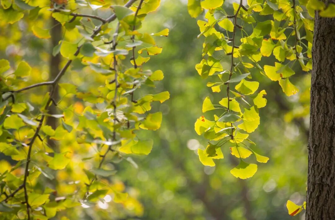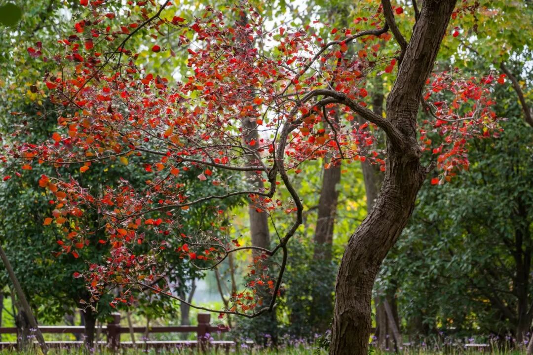 不远处的银杏则悄然换上浅黄新装,扇形叶片在光影中摇曳,宛如一串串灵动的小灯笼,添了几分俏皮的意趣。