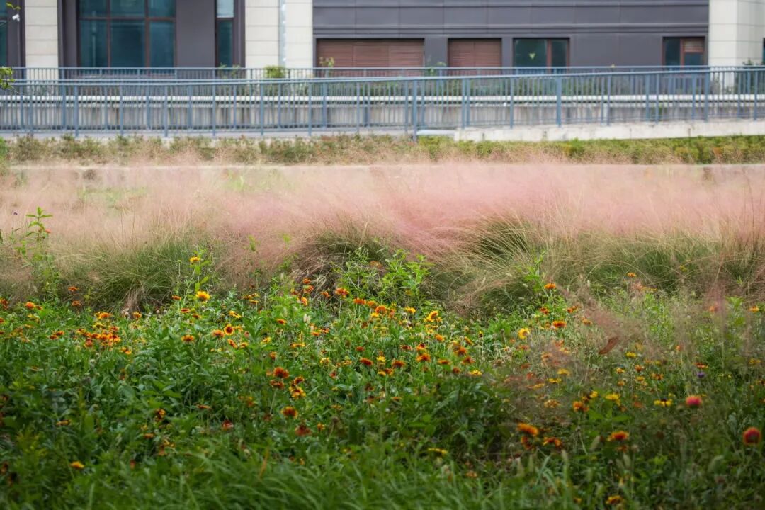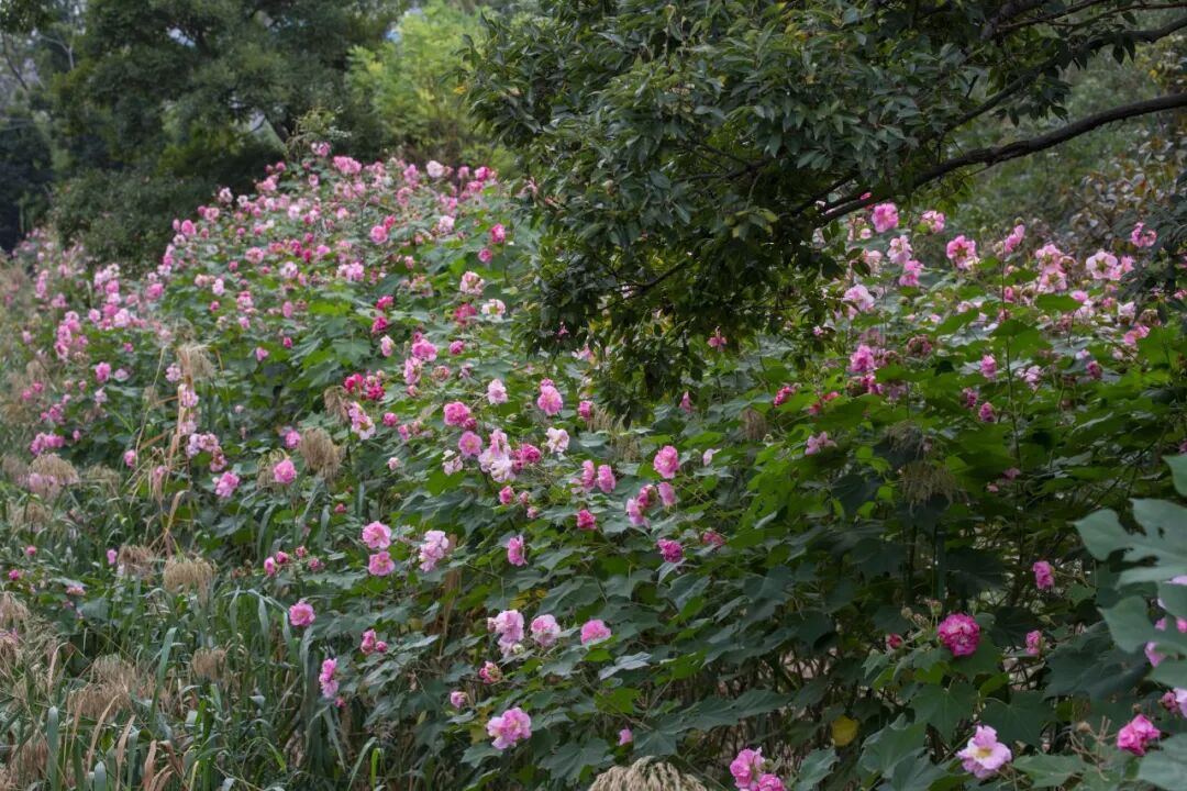 各色植物交织错落,红、黄、绿三色相映,移步换景间皆是秋韵。