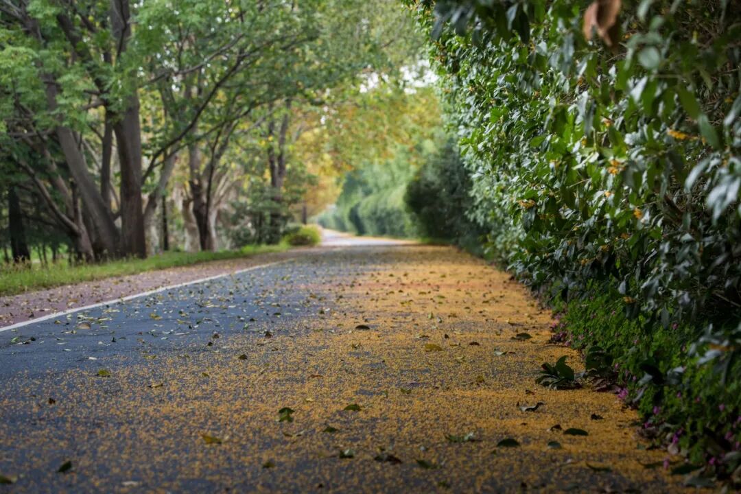 踏入绿道,清甜的桂香率先萦绕鼻尖。金黄的桂花缀满枝头,微风过处,花瓣簌簌飘落,在步道上铺就一层松软的“金毯”,踩上去沙沙作响,靠近大树,桂花的香气愈发浓厚。