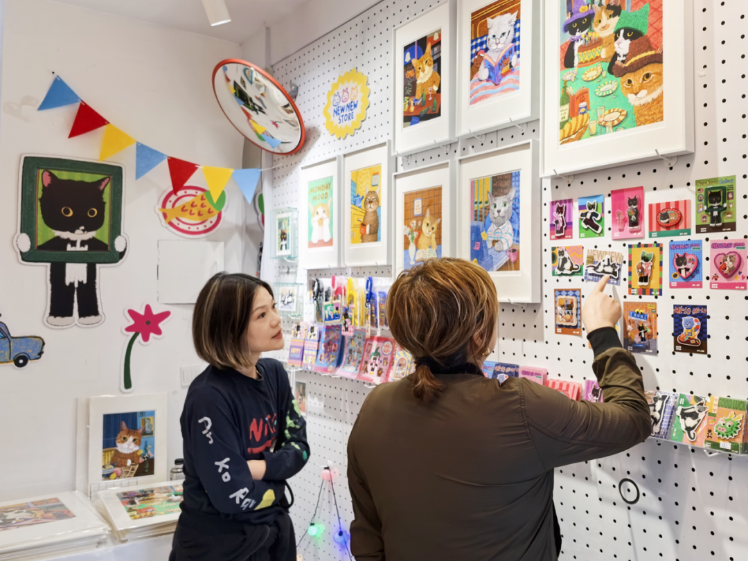“驻扎”故事商店,她与来往的到访者谈天说地,从交流中愈发喜爱上愚园路街区的烟火气。“前几天店里来了一对来自马来西亚槟城的母女,我们从创作聊到美食,没想到她们在上海开了餐饮店,供应的家乡特色菜正是我旅游当地时最爱吃的美食,她们特别热情邀请我,喊我一定要过去再尝尝‘炒粿条’。”林菁菁说,这段时间,故事商店已成为她心中的温暖据点,“接下来我计划在创作中融入愚园路元素,打造一个全新的市区系列,让更多人通过插画感受上海的城市魅力和包容氛围。”