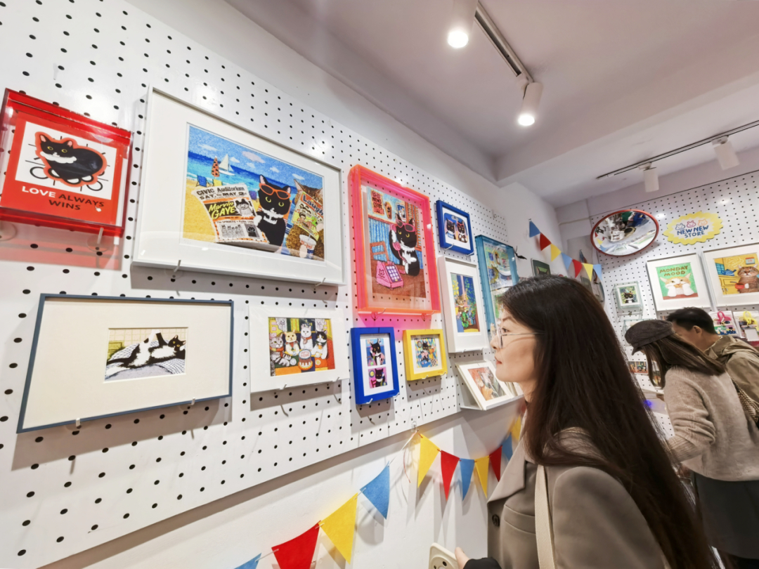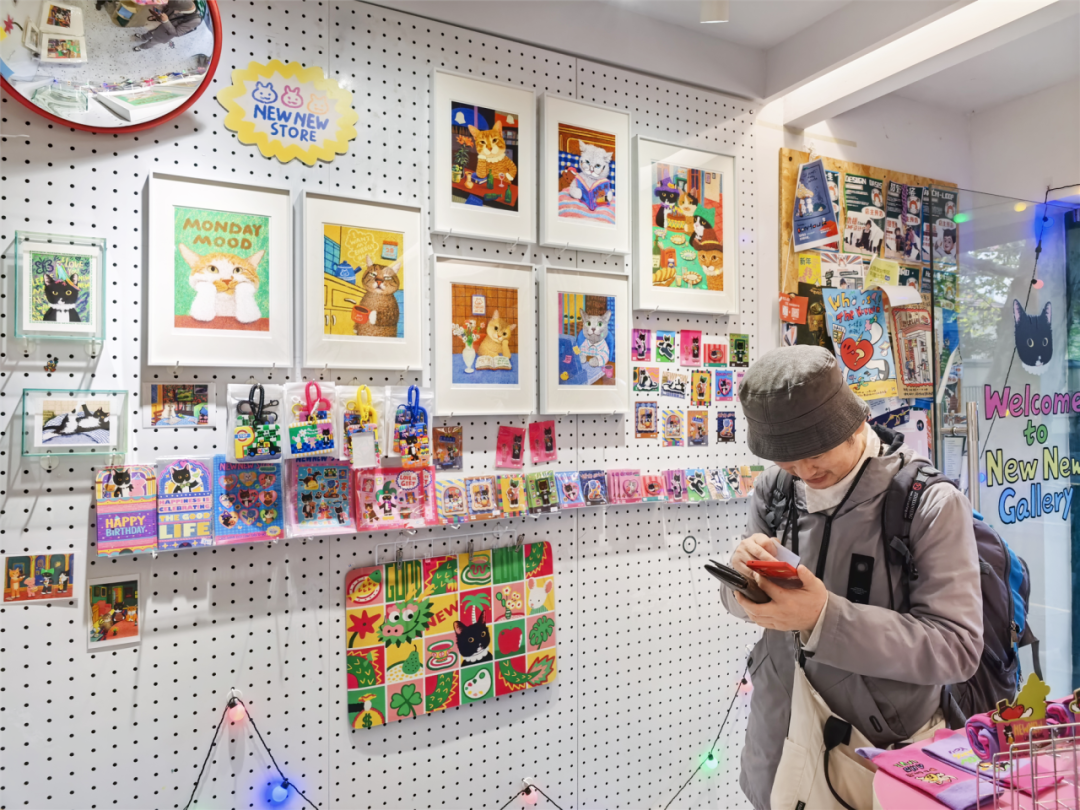 “这是我首次‘拥有’一家‘店’,特别有意思!”林菁菁介绍,“NewNew Gallery”持续开放至11月底,将故事商店打造成了一座限时画廊,展陈系列插画和文创,“布展时,我加入了很多可互动、更吸睛的设计。插画也都是精挑细选,作品之间还暗藏着彩蛋。比如,你能找到许多‘打电话的牛牛’,仿佛将作品的故事串联起来,引发人们的想象。”