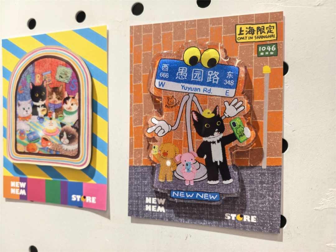 店内文创有趣又实用,易于装饰空间的冰箱贴始终是热门品类,明信片、版画、贺卡、袜饰、手机支架、卡套、地垫等也受到关注。事实上,把插画衍生为文创并非易事。以贺卡为例,因采取的抽拉式设计,前期需要反复打磨制作工艺,让画面创意和功能性兼备。