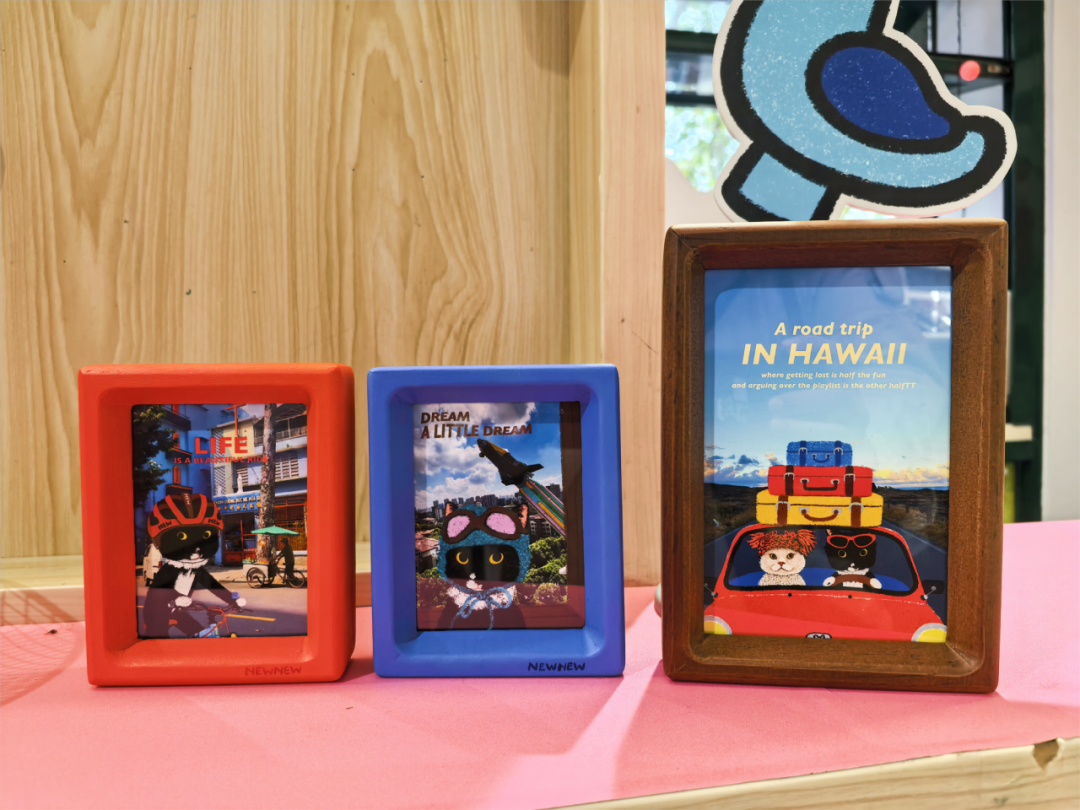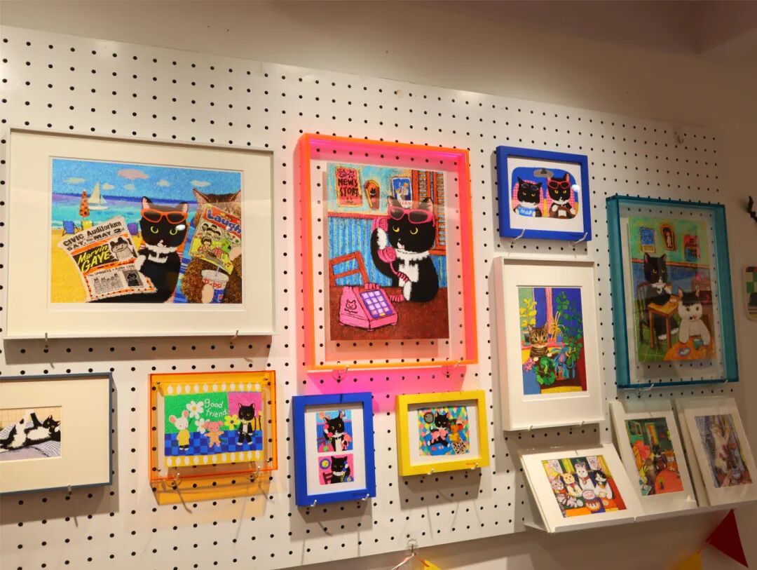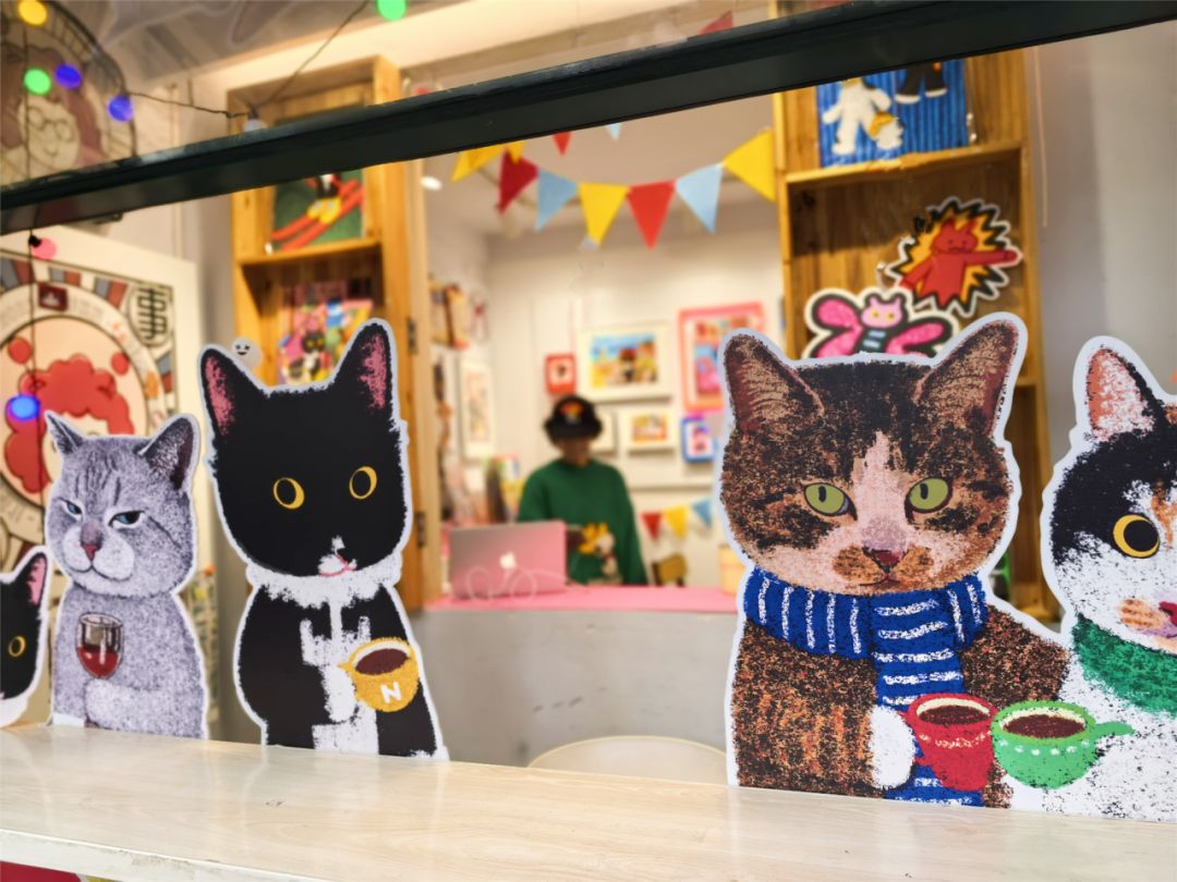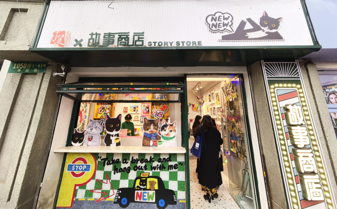 “NewNew”谐音“牛牛”,是林菁菁爱宠奶牛猫的名字,也是诞生于2019年的原创IP。来到故事商店可以看到,牛牛和小伙伴们乘坐出租车抵达,便端起咖啡欣赏街区美景,举手投足间满是潮流小猫的腔调。店内,林菁菁正在与喜爱其作品的市民畅谈创作理念,送走一批批客人后,她细心整理好店内商品,才得闲向记者介绍起本次展览。