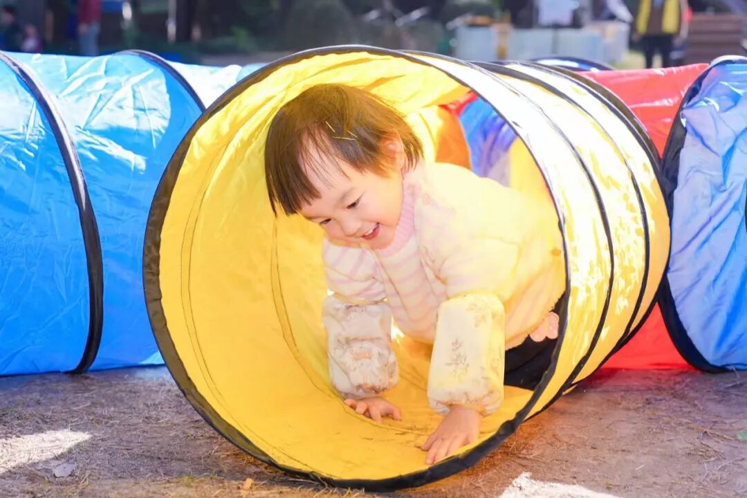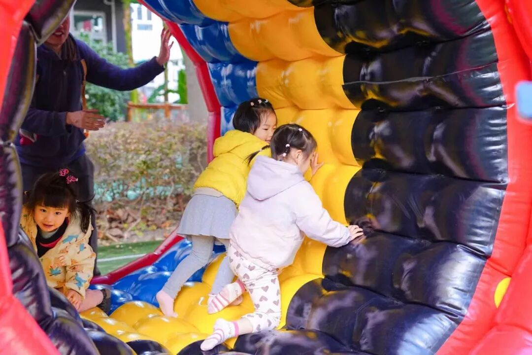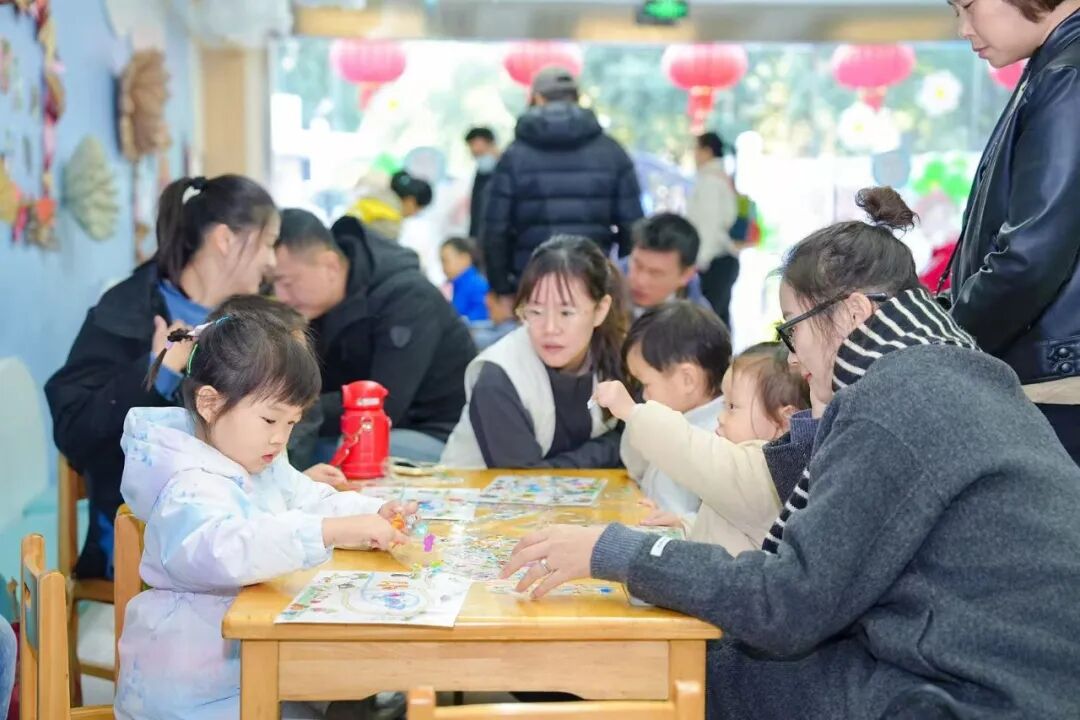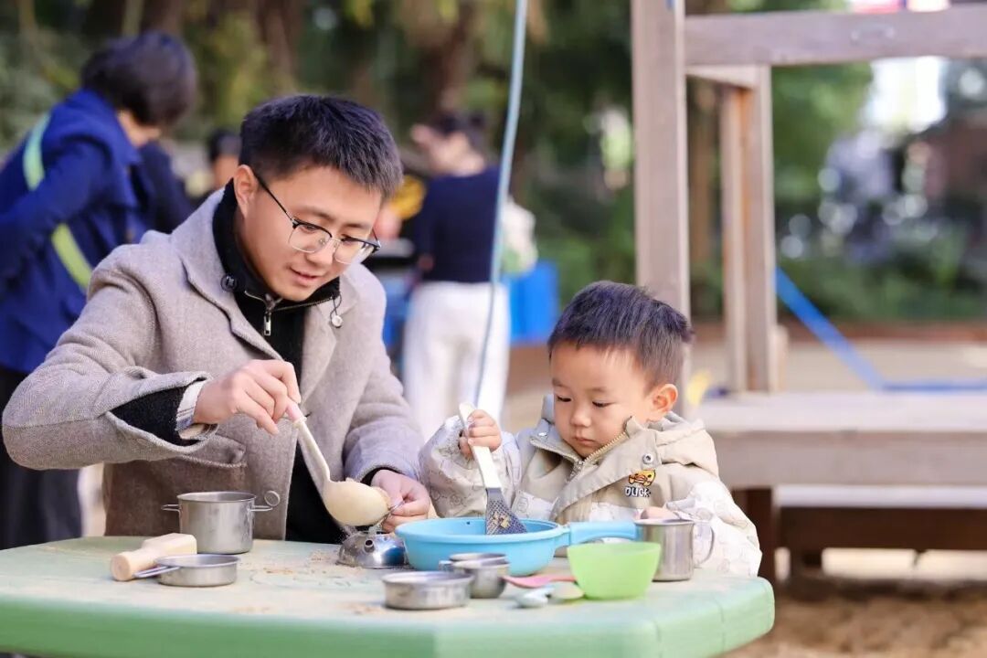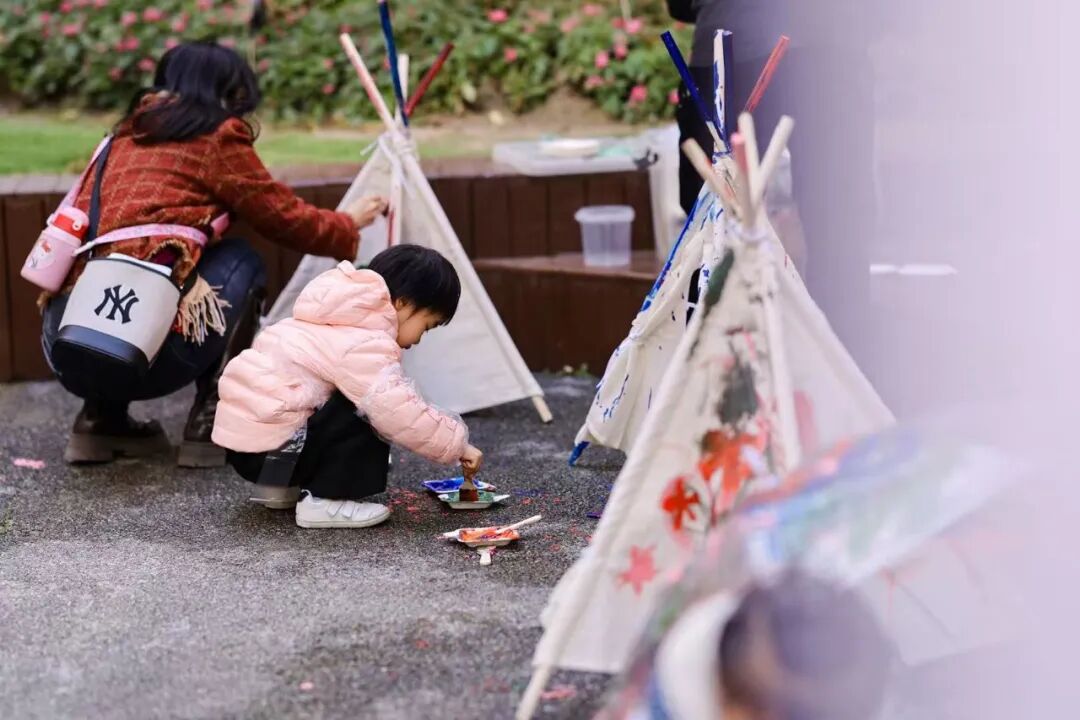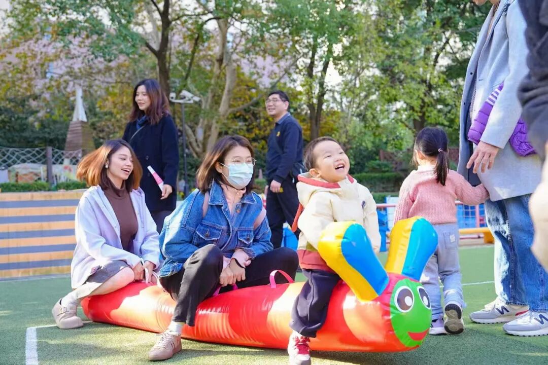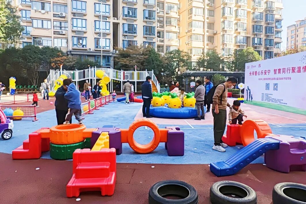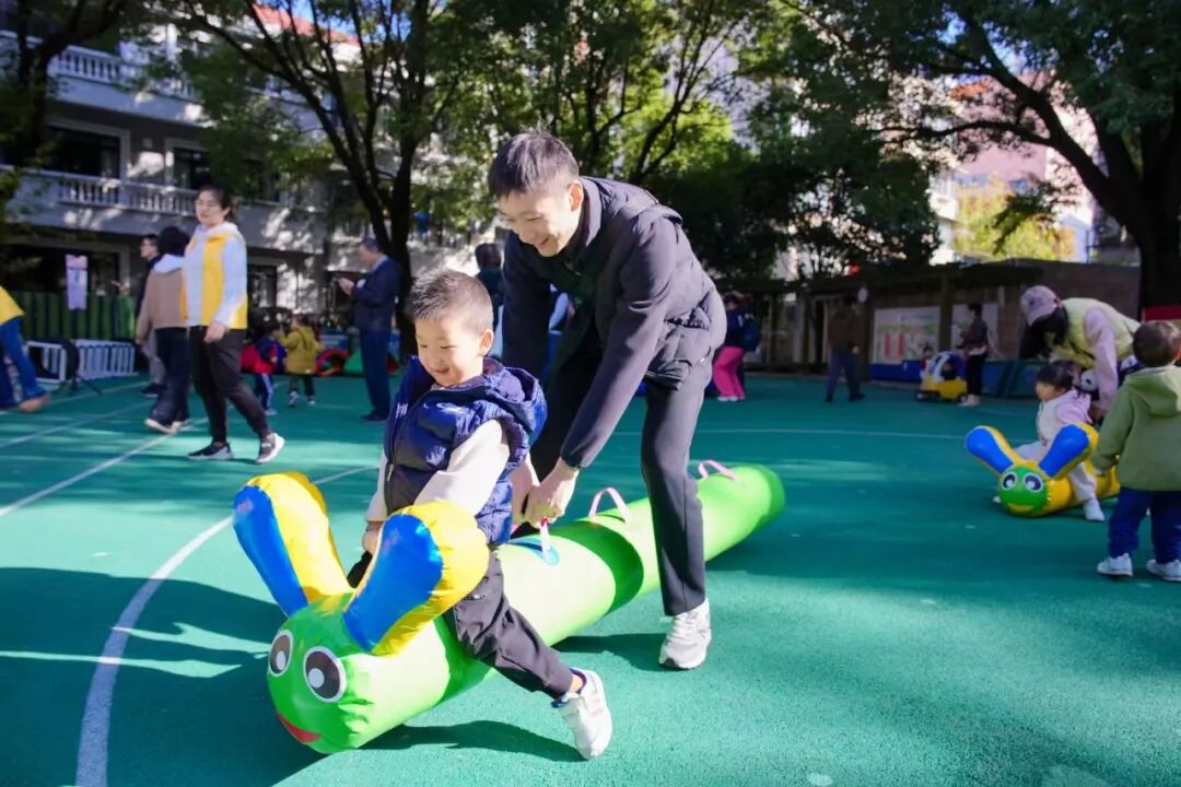 与此同时,精心设置的“加油·小人国游戏指导”活动,成为亲子家庭尽情撒欢的乐园。坐落于苏州河畔的主会场新实验幼儿园,以其城堡般的外观、沙水天地等童趣设施,为孩子们营造出一步一景的游乐空间。趣味飞镖、创意压花、沙趣小派对、夹球小能手……17项户外游戏与28项室内游戏,兼顾不同月龄婴幼儿的运动能力与精细动作发展需求。丰富多样的材料与趣味盎然的形式,不仅让孩子们尽情释放天性,更让亲子情感在互动中悄然升温。现场,专业教师也在旁边积极引导,帮助家长增强“七会”能力——会照料、会抚爱、会陪玩、会沟通、会放手、会等待、会示范,将游戏转化为生动的教育实践。