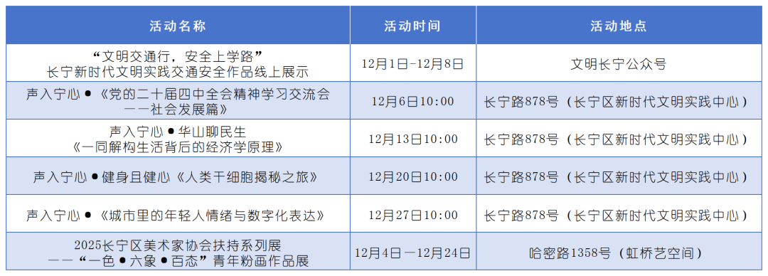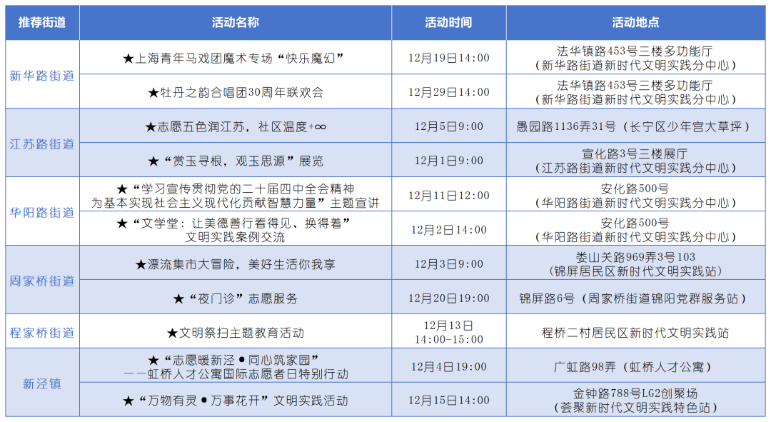 进入十二月,长宁区新时代文明实践活动中心与各街镇分中心继续携手为广大市民带来众多暖心有趣的活动,一起来看看吧↓
