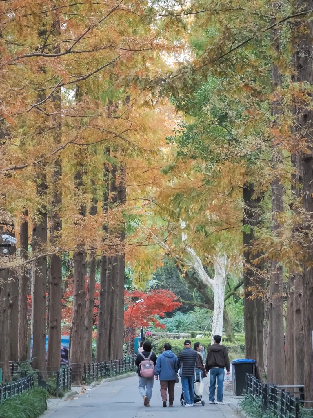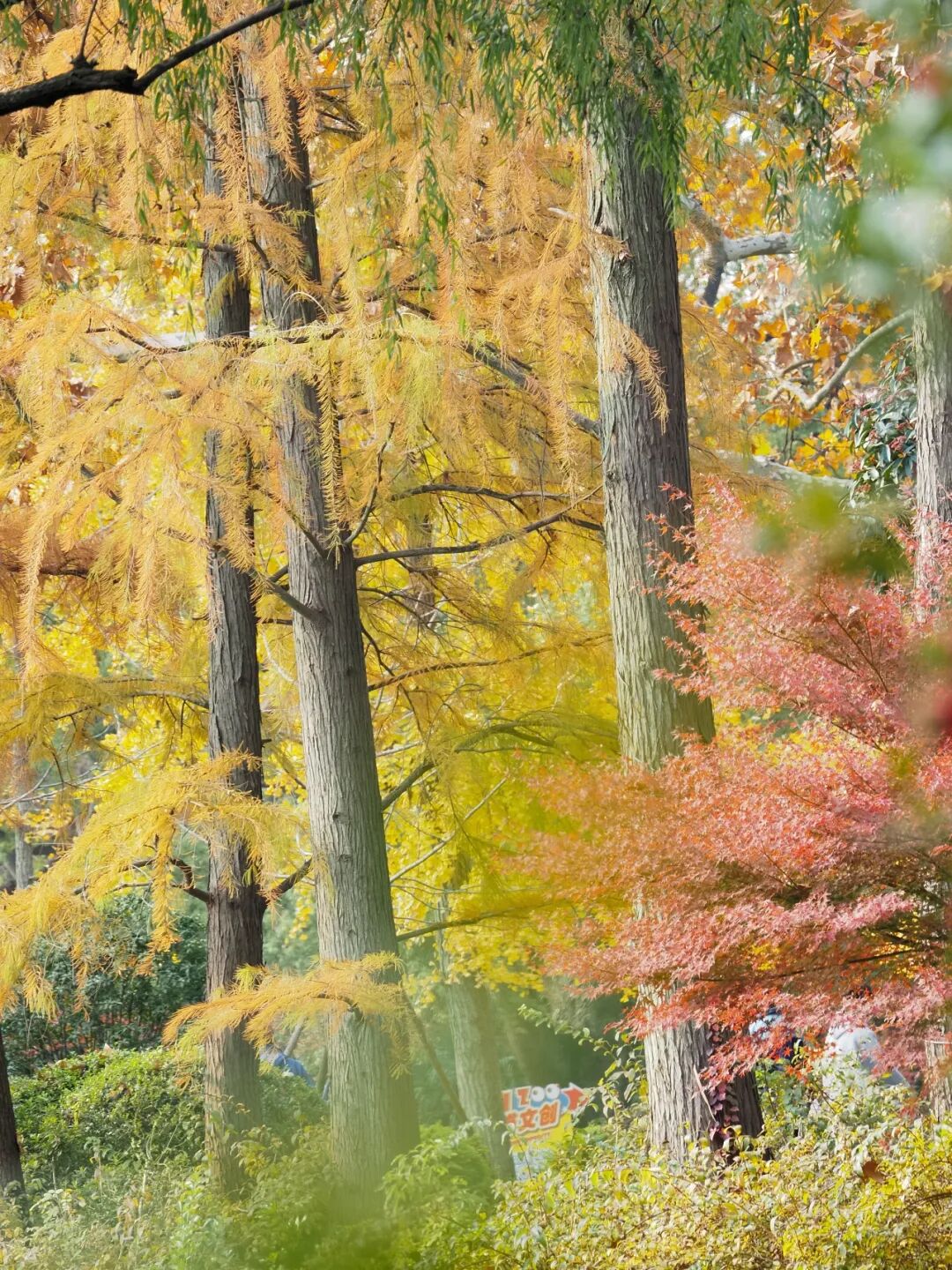 随着冬日的脚步越来越近,杉树也成为了这个季节毫无争议的“顶流”之一。上海动物园的杉树虽然不多,但树冠高大,亦可赏景。当树林逐步褪去青绿,渐染橙红和金黄,像是被画师“涂抹”上的色彩。