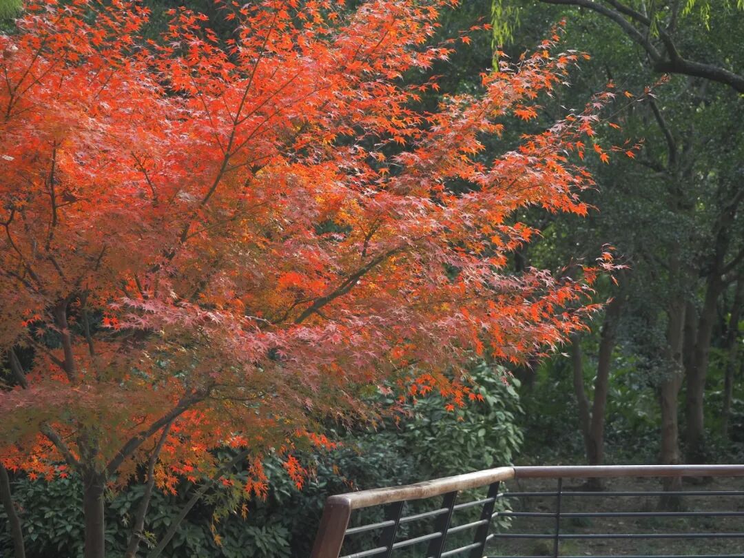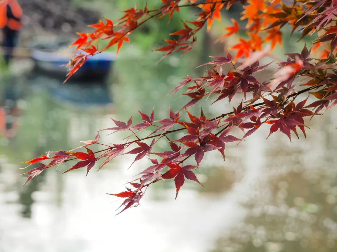 枫树也是“红”得正当时。在动物园的小河和小池旁,往往可以看到一两株枫树,红得鲜艳又热烈,枝条的姿态也舒展且飘逸,将池水染出淡淡的红色,颇有中式园林的意境之美。