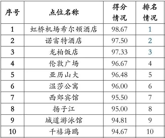 调查结果显示,长宁区游泳场馆满意度得分为89.38,处于满意与较满意之间。具体到各家游泳场馆,虹桥机场希尔顿酒店、诺富特酒店、龙柏饭店得分排名前三。值得一提的是,在排名前十的游泳场馆中,酒店游泳池占据六席,小区游泳池占据四席,酒店类场馆在硬件条件和综合体验上的优势较为明显,也反映出消费者对游泳场馆硬件设施的高度重视。