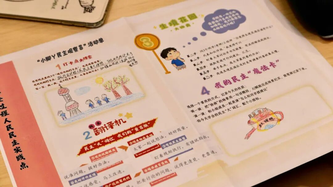 “我们画出了生境花园建设的场景。”在活动单上,同学们通过文字记录、简笔画描绘,捕捉着感兴趣的细节。而在随后的“翻译机”环节,孩子们开动脑筋,将“民主监督”“协商互动”“建言献策”这些民生“大词汇”,转换成自己看得懂、说得明的“童言版”释义。一系列的自主探究,让孩子们直观地感受到了民主实践的具体形态,建立起对民主内涵的初步认知。
