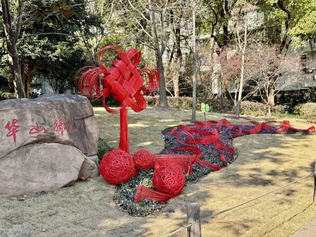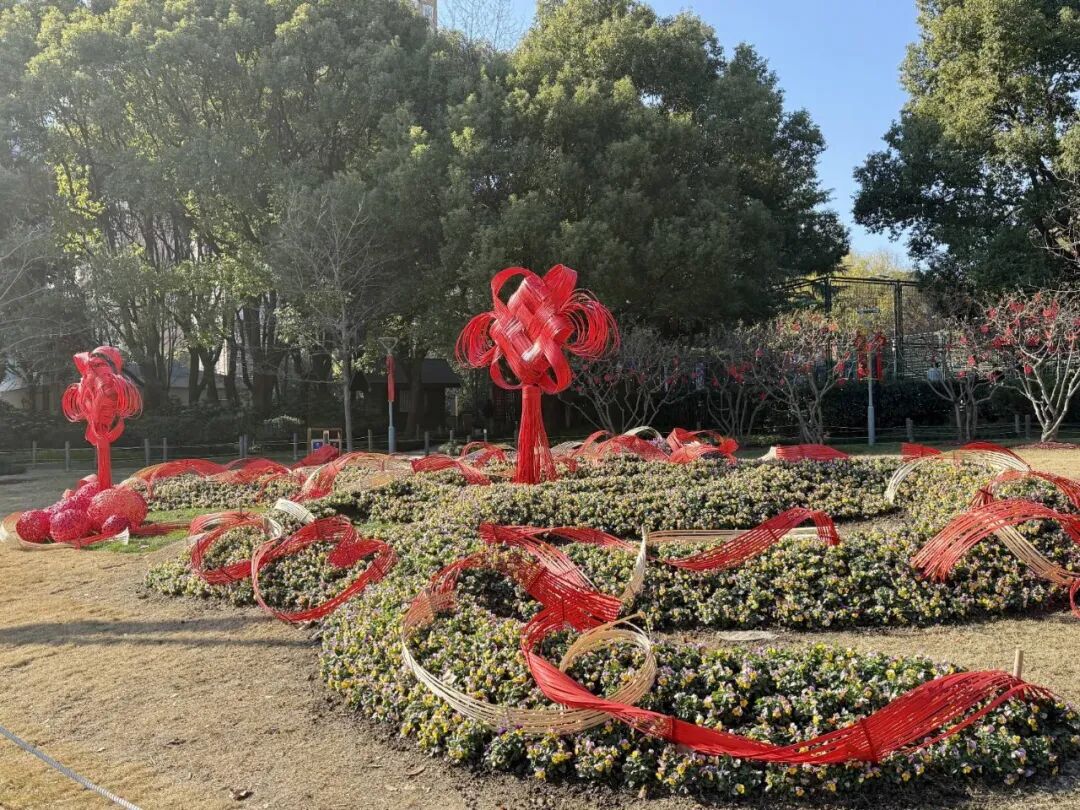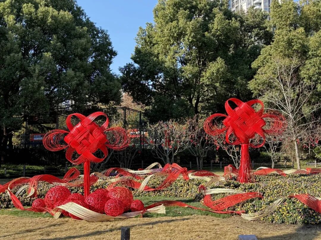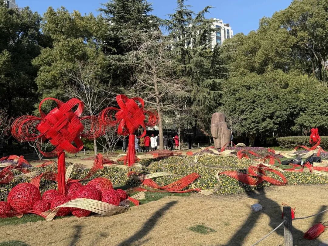 步入华山绿地,红色竹编中国结装置错落分布于草坪与步道之间。竹片层叠交错,勾勒出轻盈流畅的立体线条,既似红绸金缎凌空舒展,又若彩练当风翩跹起舞。冬日暖阳洒落,竹材的温润本色与点缀其间的中国红相映成趣,光影流转间,为静谧的城市绿地注入了灵动欢愉的新春气息。