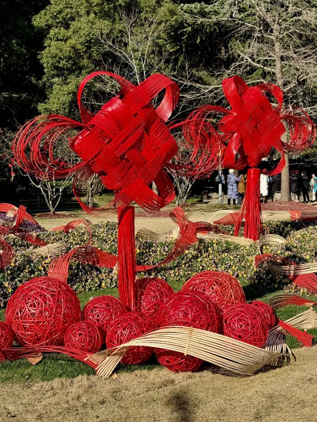 近日,五组以中国结为创意原型、采用天然竹片手工编织而成的公共艺术装置,在华山绿地亮相。竹材的温润质感搭配亮眼的中国红,在冬日暖阳下格外惹眼,为市民游客奉上一场雅致暖心的新春视觉盛宴。