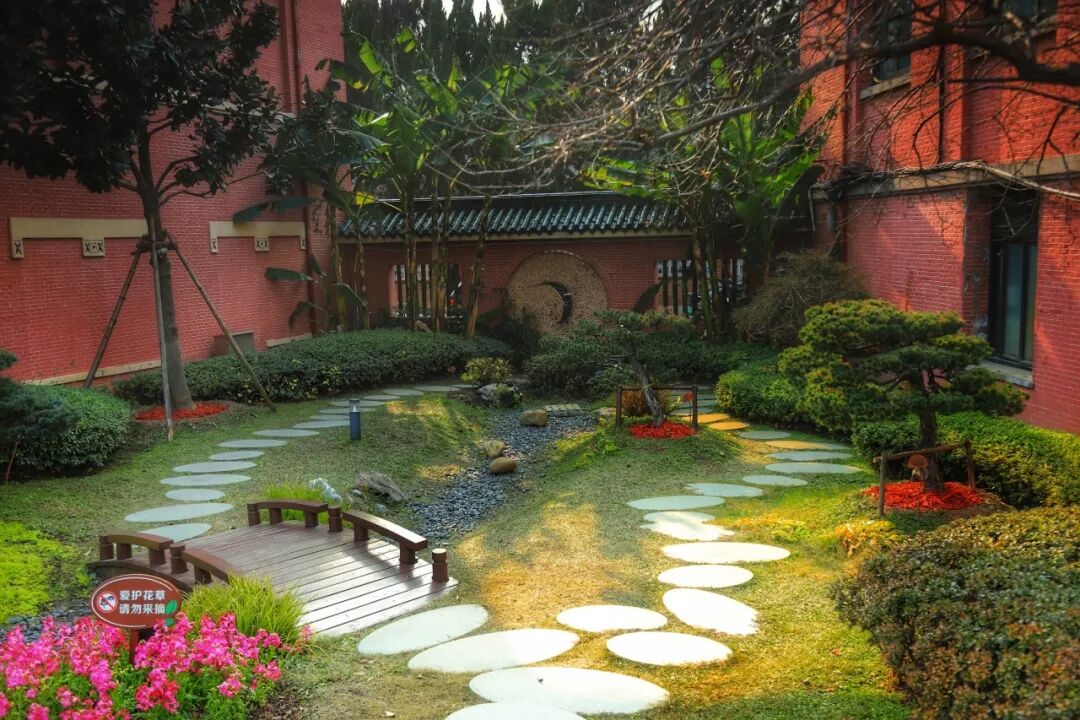 华政长宁校区被苏州河180度环绕,宛如一座楔形半岛,长约910米的滨河步道串联起“滨河十景”——思孟园、格致园、倚竹院、獬豸园、华政桥、桃李园、东风角、法剧场、银杏院和书香园,一步一景皆有韵味。