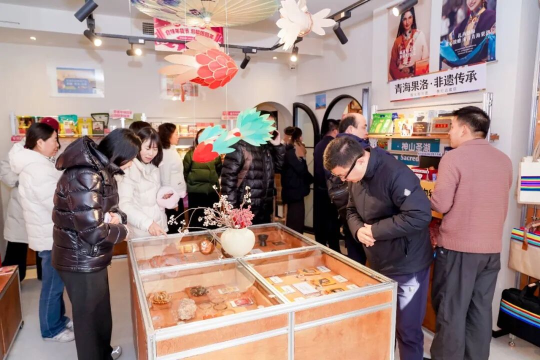 穿过咖啡区,核心展销区构建了“九大品类+精品专区+对口县域”立体化产品体系。作为全市23家“百县百品”直营店之一,这里专注呈现优质帮扶产品,新疆切片列巴升级为独立包装,云南冻干玫瑰抱抱桶价格亲民,爆款产品兼具实用性与高性价比。展区里,长宁对口帮扶地区的特色产品尤为亮眼:红河州绿春县的茶叶制成“隐茶杯”,杯底预封装茶叶,即冲即饮,适配办公与会议场景;挂耳式玛玉红茶、四口味红河红米线贴合现代生活节奏;哈尼族绣娘手作等文创产品,让传统工艺融入都市日常。青海果洛甘德的牦牛肉干等特产专区,还有驻沪推荐官现场讲解,传递高原独特风情。