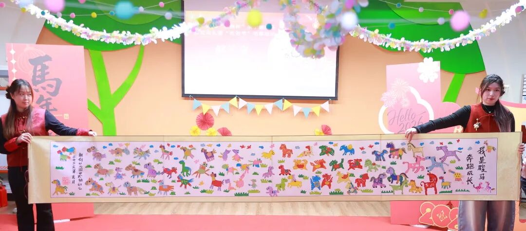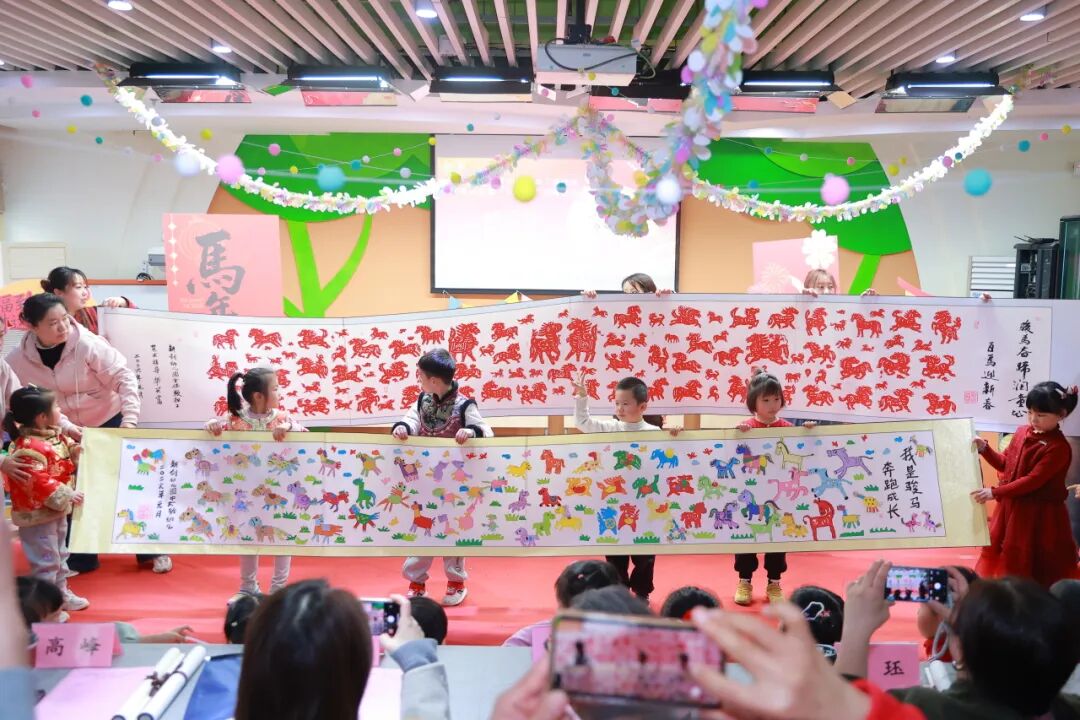 动现场还展出了“骏马奋蹄润童心 一百马闹春”6米长卷。百余匹“骏马”形态各异、憨态可掬,或昂首嘶鸣,或奋蹄疾驰,或缓步前行,在长长的画卷上构成了一幅“百马闹春”的热闹图景。这幅凝聚着全体教职员工心血创作的长卷,是非遗文化在代代相传中焕发的新生机,每一张撕纸、每一次粘贴,都承载着大家对新春的祝福,对传统文化的喜爱。