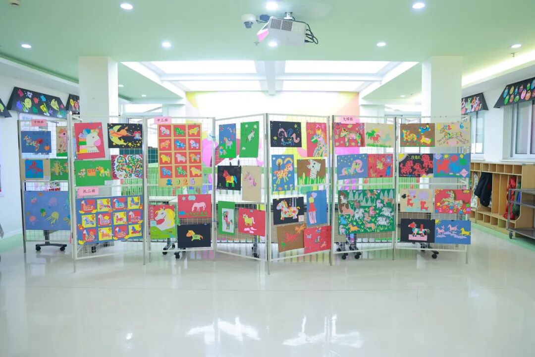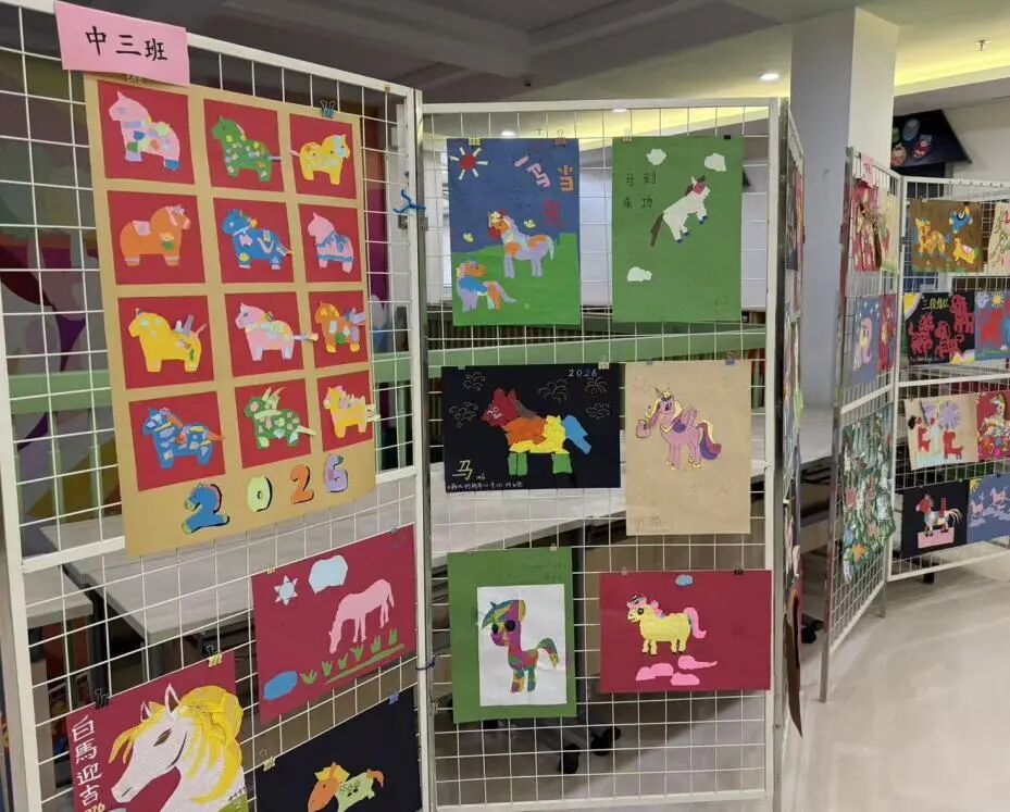 在新剑幼儿园,走廊化身为充满童趣的纸艺长廊,百余幅亲子撕纸作品创意十足:有的家庭以经典典故为灵感,用多层撕纸拼贴出气势恢宏的“八骏图”,马的鬃毛层次分明、四肢强健有力;有的将撕纸与手工制作相结合,用彩纸撕出的马身搭配扭扭棒勾勒的缰绳,做成栩栩如生的骏马手偶;还有的别出心裁,以碎纸拼贴出抽象派的奔马造型,或以撕纸字体拼出“马到成功”等吉祥话语,每一幅作品都融入了孩子们对“马”的灵动想象与家长的用心陪伴。