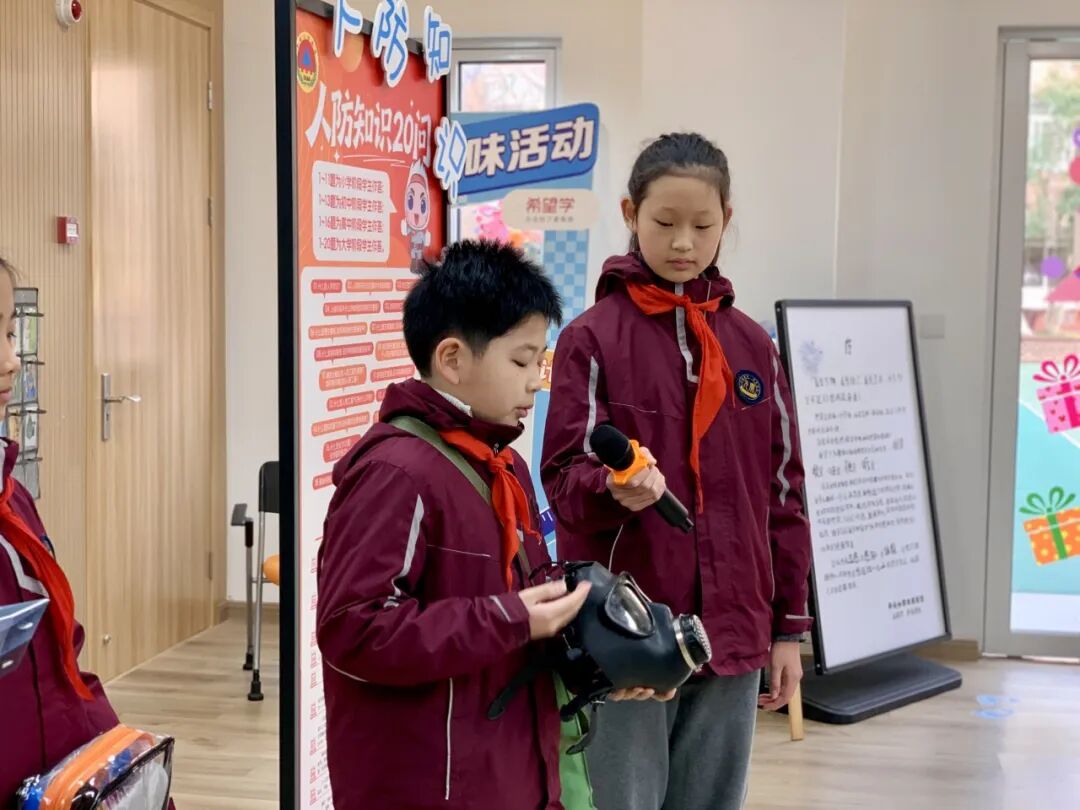 活动伊始,“人防基础知识20问”竞答环节便点燃全场氛围。面对瞿平提出的人防历史、防护常识等问题,同学们积极应答,清脆的回答中展现出知识的积累。随后,学校人防宣传小分队的“国防小讲师”们轮番登场,不仅用通俗的语言讲解人防核心要点,更现场示范防毒面具佩戴、应急包取用等实用技能,动作规范流畅,赢得阵阵喝彩。现场展示的学生原创人防主题作品与憨态可掬的吉祥物“小海娃”,将抽象的安全知识转化为直观可见的文化载体,让同学们在观赏中加深理解。