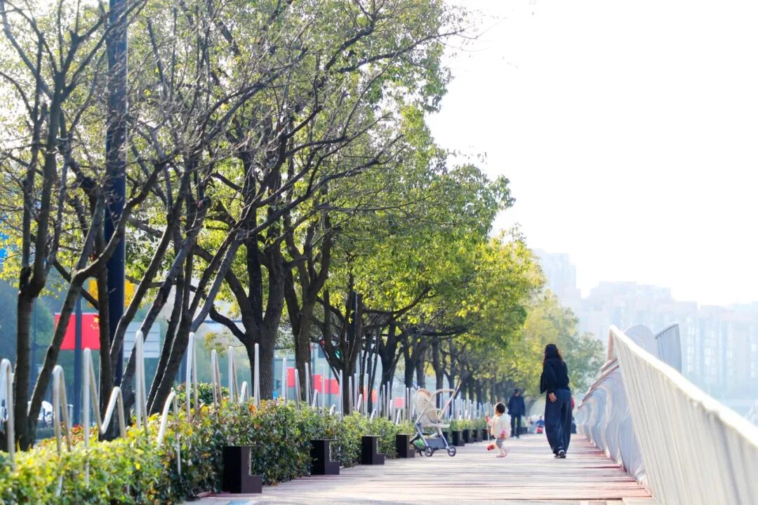 从苏河步道走进去,便是虹桥河滨公园,毗邻虹桥河滨花园小区,公园建于2003年10月,2004年10月正式对外开放。它也是长宁苏州河边10个活力公共空间之一,园内有篮球场、儿童乐园、木质休闲廊架等,满足居民们健身锻炼、休闲游乐的多样化需求。