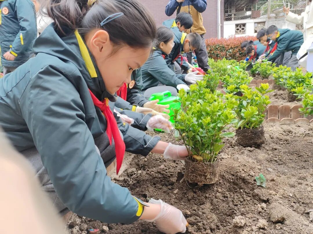 藿香、薄荷、石菖蒲、小花鸢尾......在“安顺百草园”里,少先队员们在老师的指导下挖坑、栽苗、覆土、浇水,亲手种下一棵棵中草药苗。而这一株株药苗在春风中稳稳扎根,不仅为校园增添了绿意,更在孩子们心中播下了中医药文化的种子。