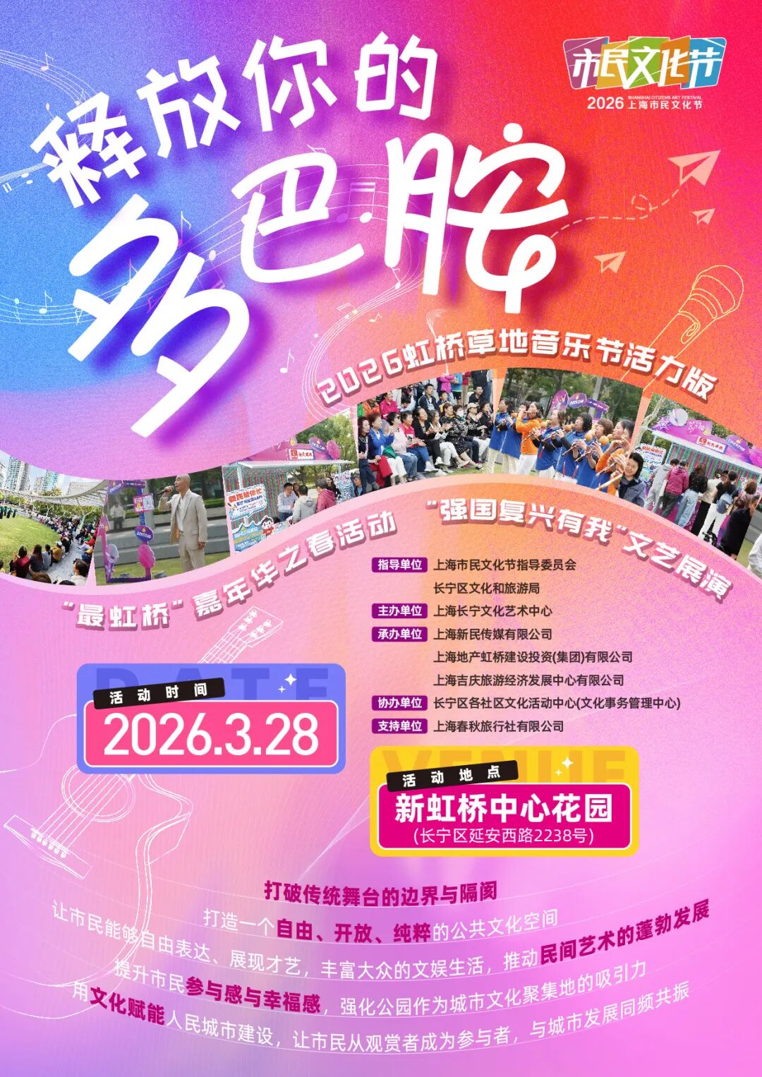 春风拂面,快乐上线!2026年上海市民文化节城市美育日(长宁区)暨“释放你的多巴胺”——2026“最虹桥”嘉年华之春活动将于3月28日缤纷启幕,春秋两季多个活动轮番登场,专场汇演、非遗体验、趣味互动、创意工坊应有尽有。即兴踢馆、欢乐互动,邀你一起解锁文化艺术的美好,释放满满的快乐因子!